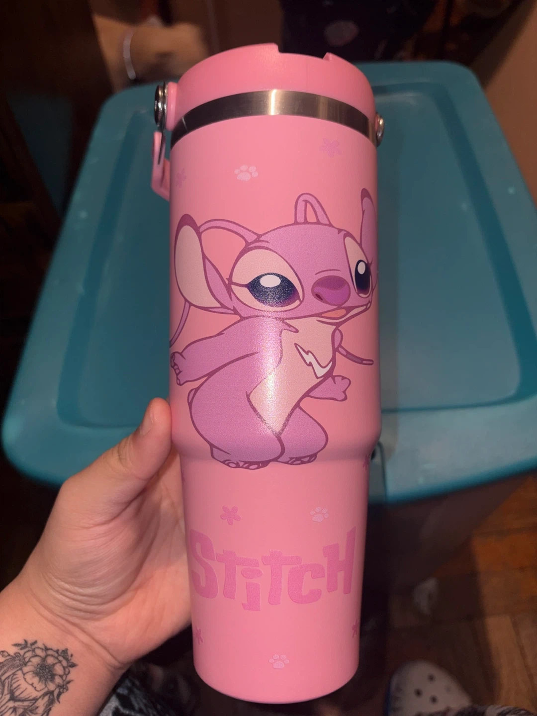 15Selling a cute pink tumbler featuring Stitch! It's perfect for keeping your drinks cold or hot on the go