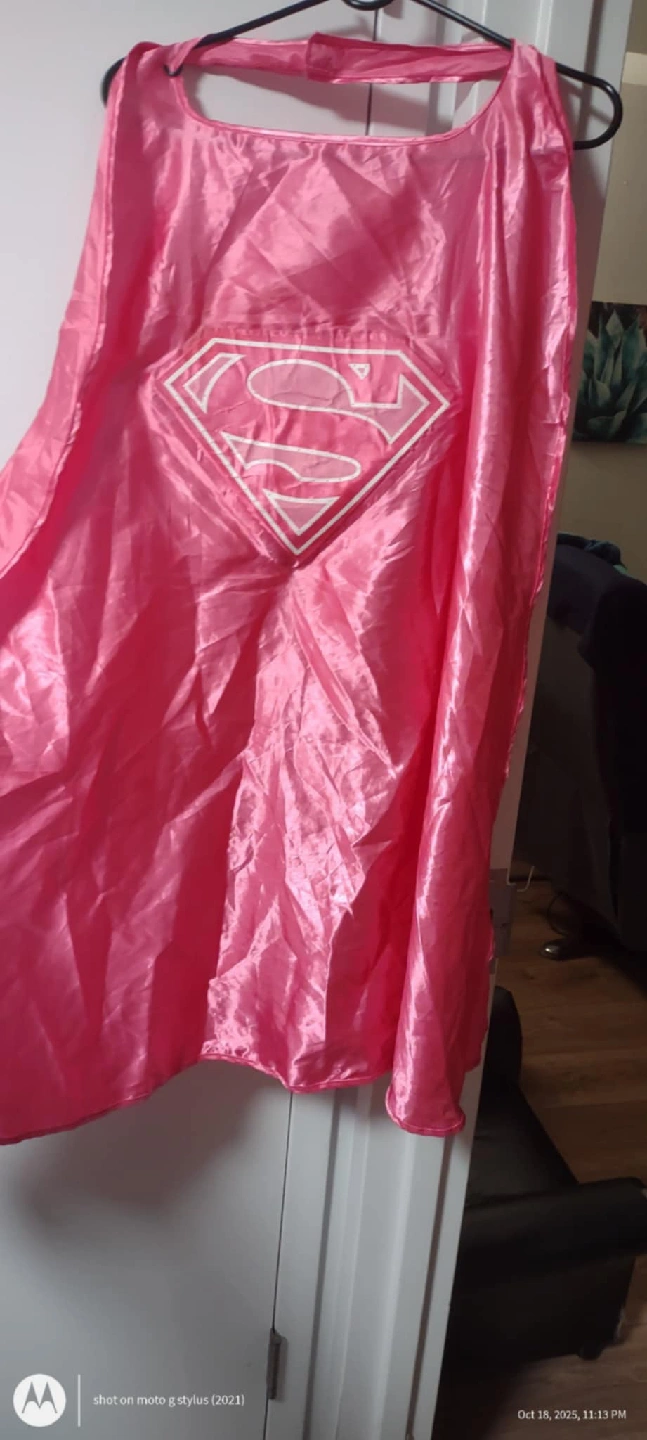 381Pink Super girl cape in good condition it has the S dimond logo on the back and it lights up good for a child but not a small one.