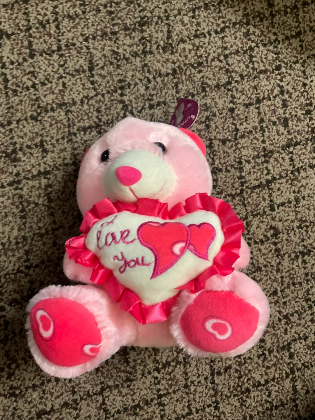 This is a cute pink teddy bear holding a heart that says 'Love You'. It's in great condition and ready for a new home!