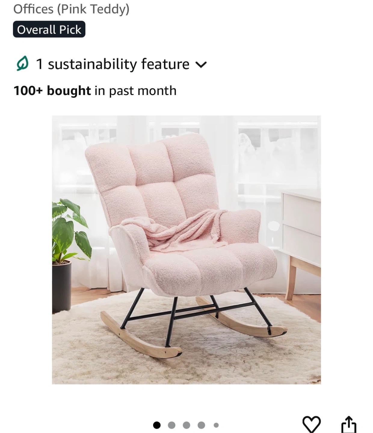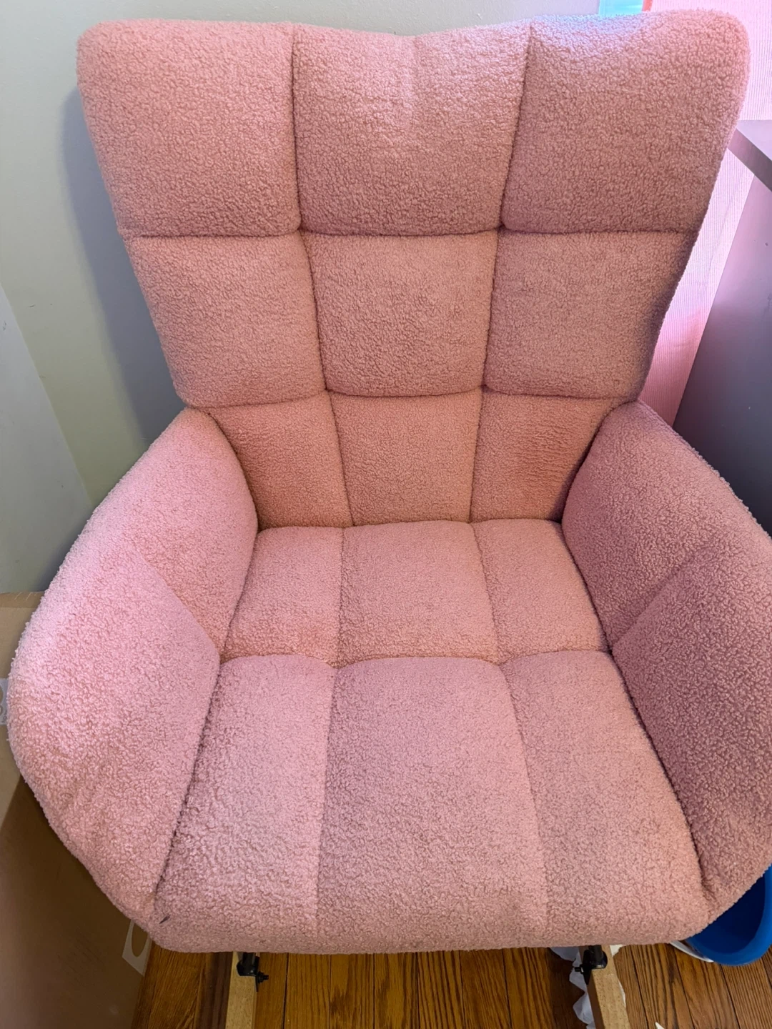 10I'm selling a super comfy pink teddy rocking chair! It's in great condition and perfect for relaxing. The soft, plush material makes it extra cozy. Add a touch of fun and comfort to your space with this chair