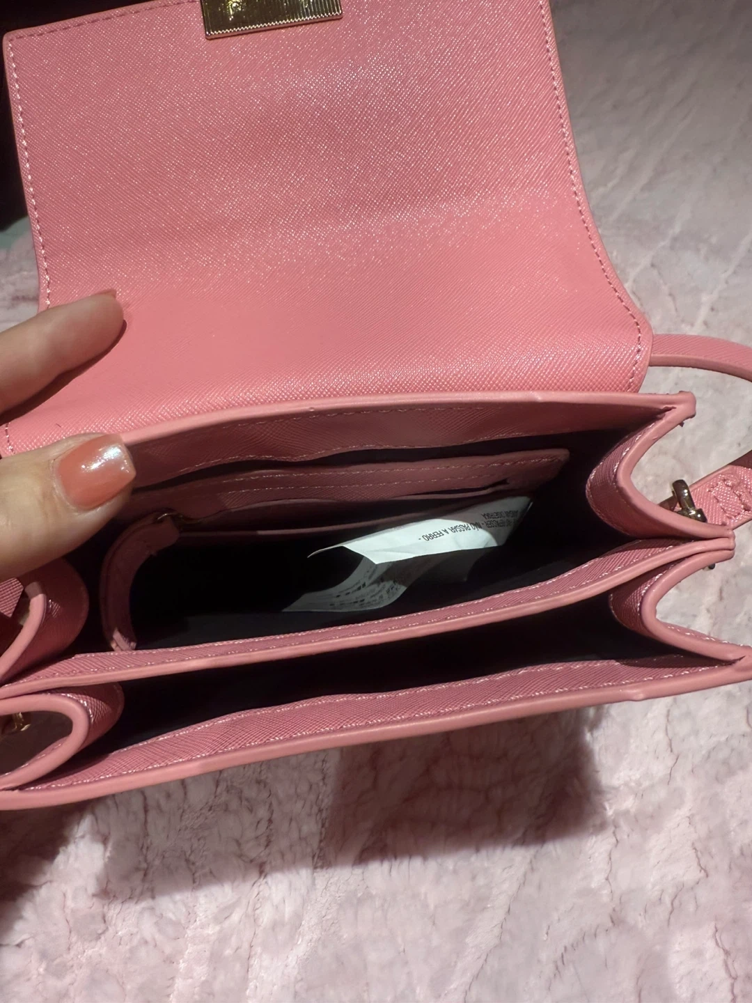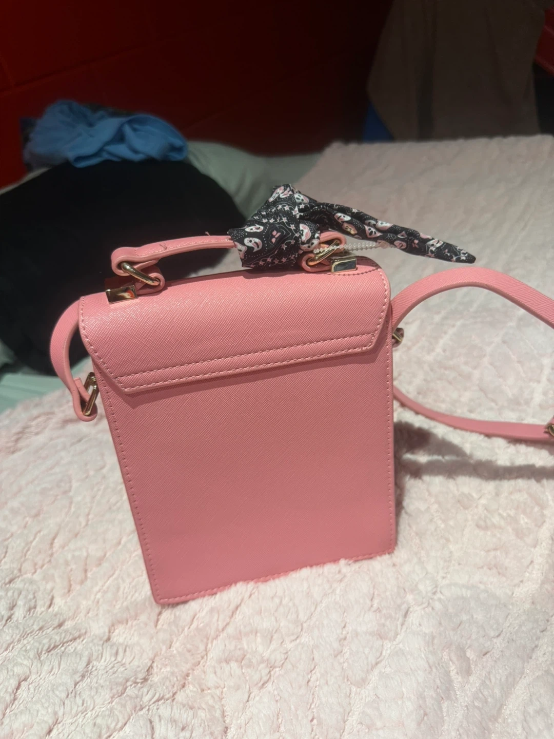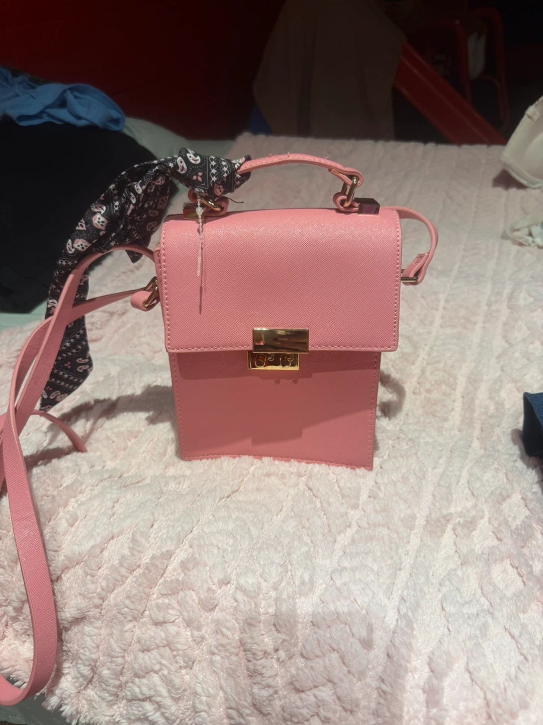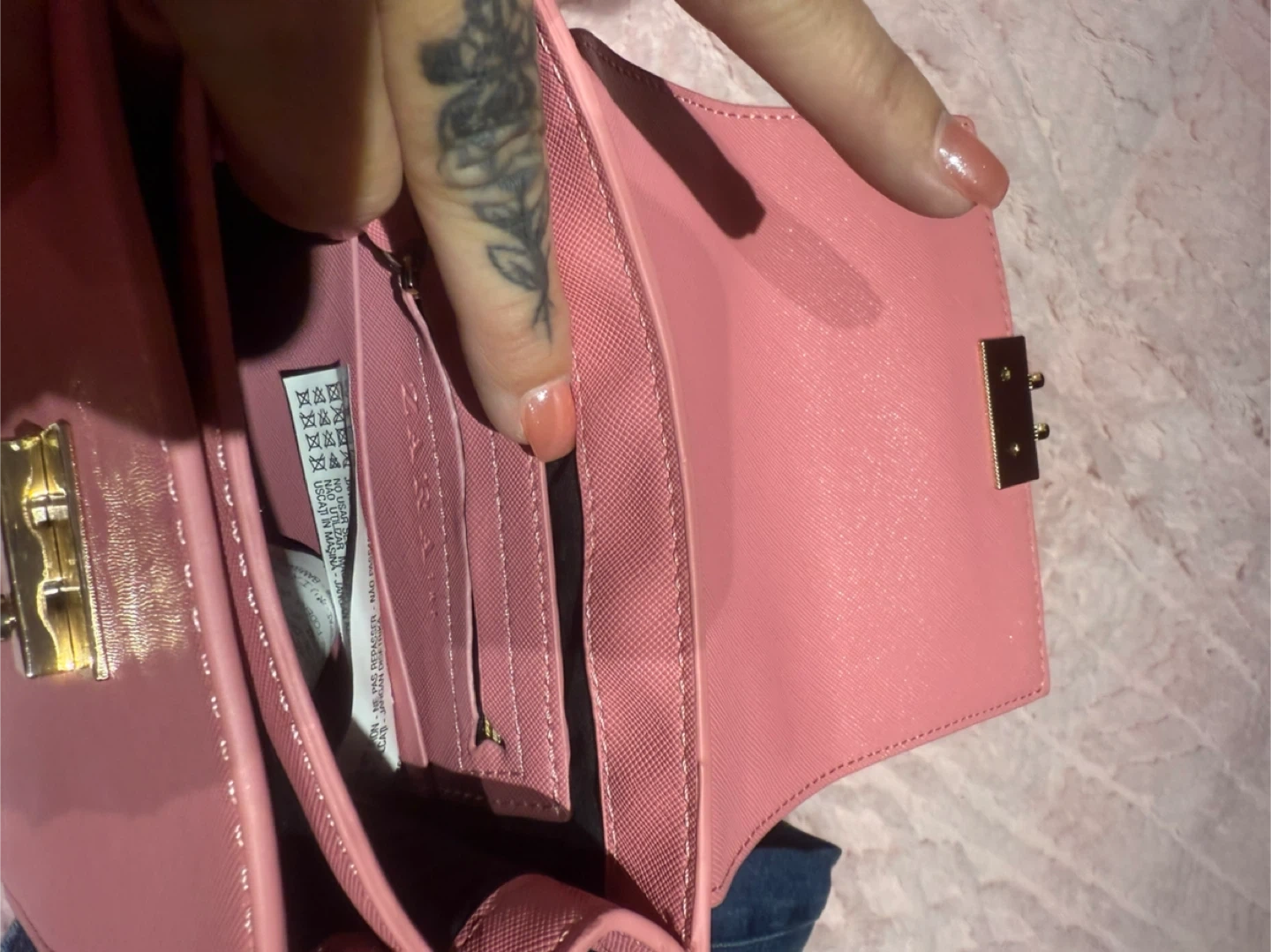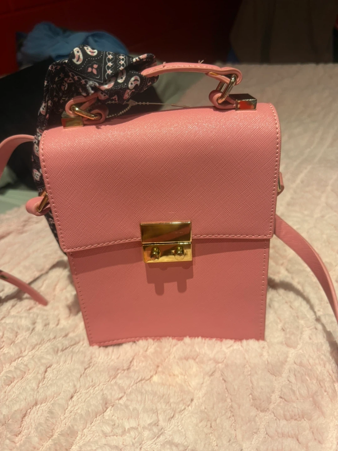 This is a cute pink Zara box bag with a top handle and a long strap. It has gold hardware and a fabric tie on the handle. The bag is in good condition and ready for a new home!
