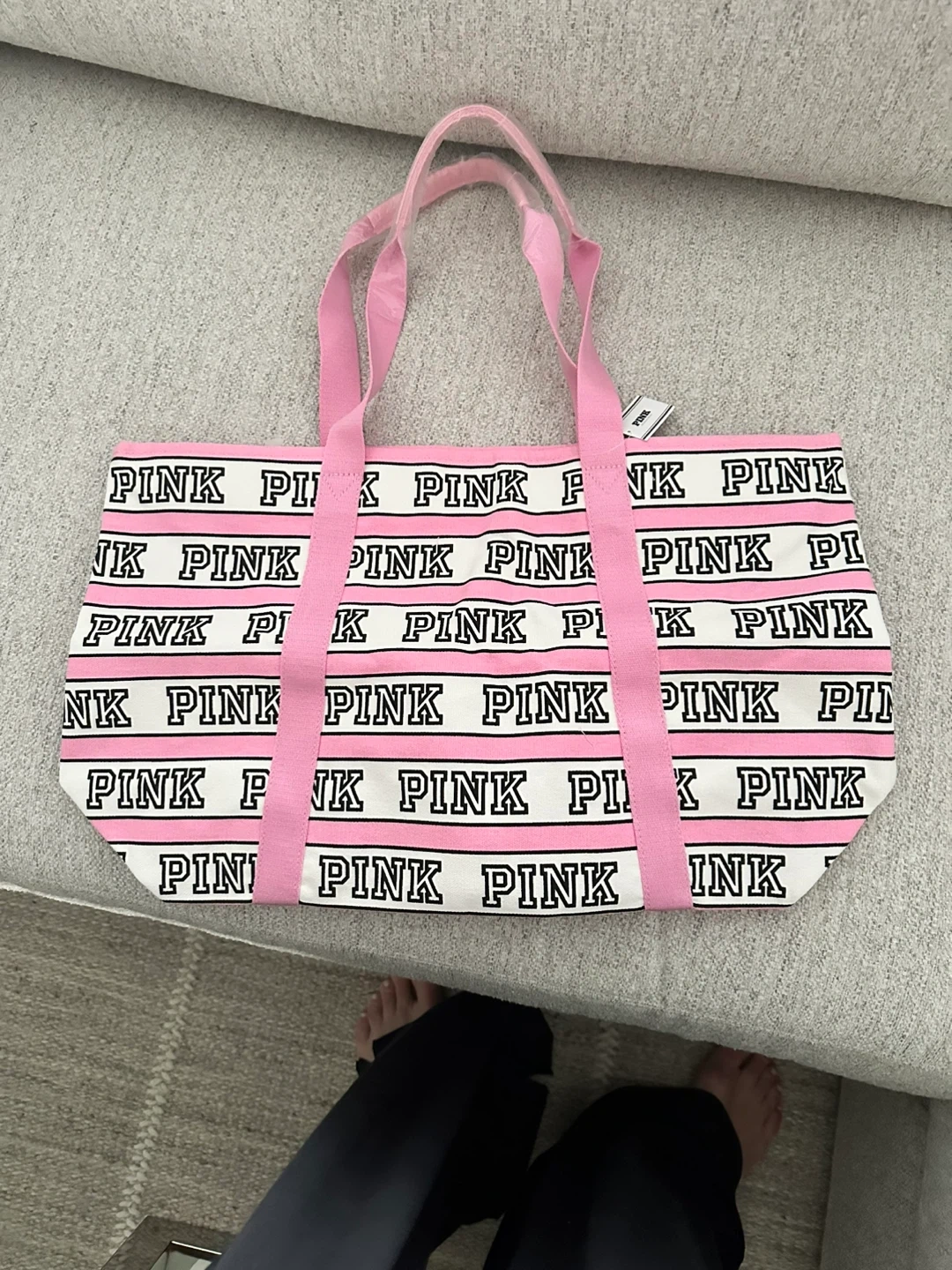 Selling a cute PINK tote bag! It's brand new and perfect for carrying your essentials. The bag features the brand's name in a repeating pattern of black text on a background of pink and white stripes. The straps are pink as well