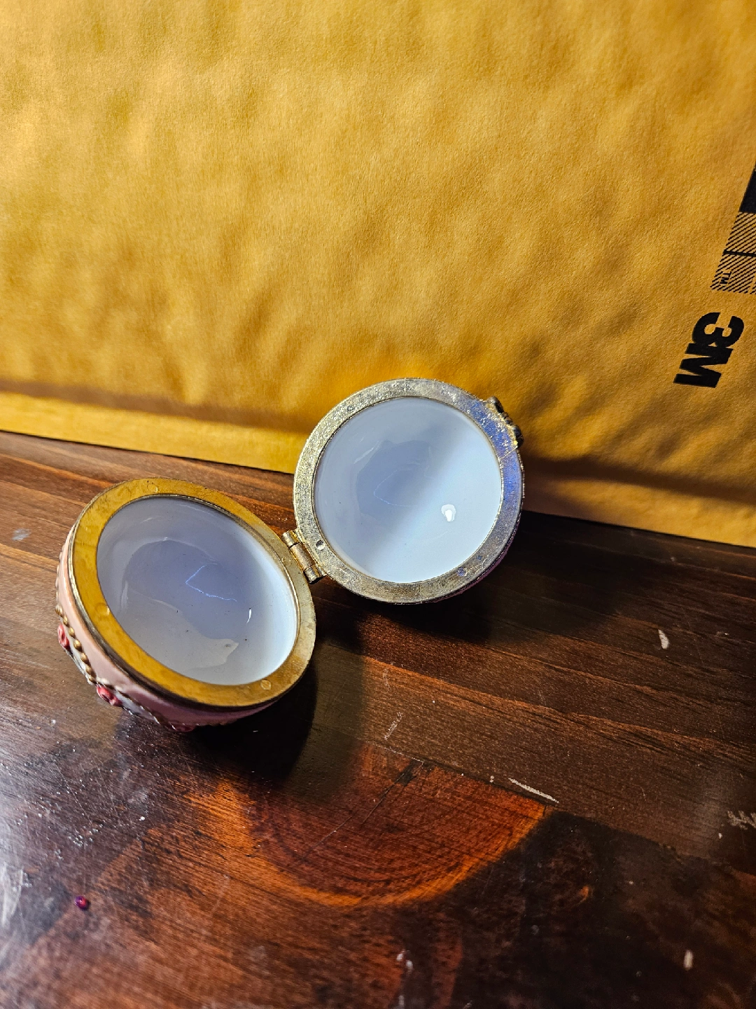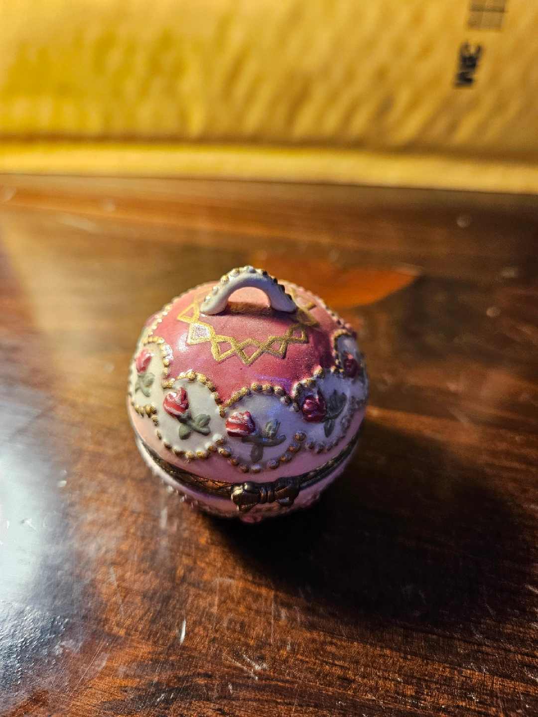 This is a small pink trinket box. It has a floral design and a hinged lid