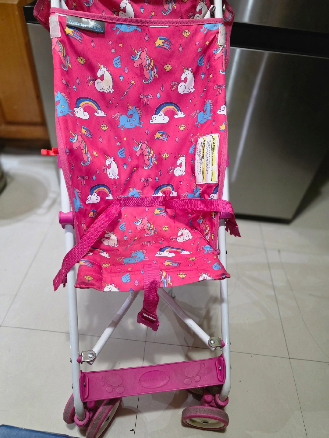 Selling a cute pink baby stroller with a fun unicorn print! It's in good condition and perfect for taking your little one on walks. The stroller is lightweight and easy to fold for storage or travel