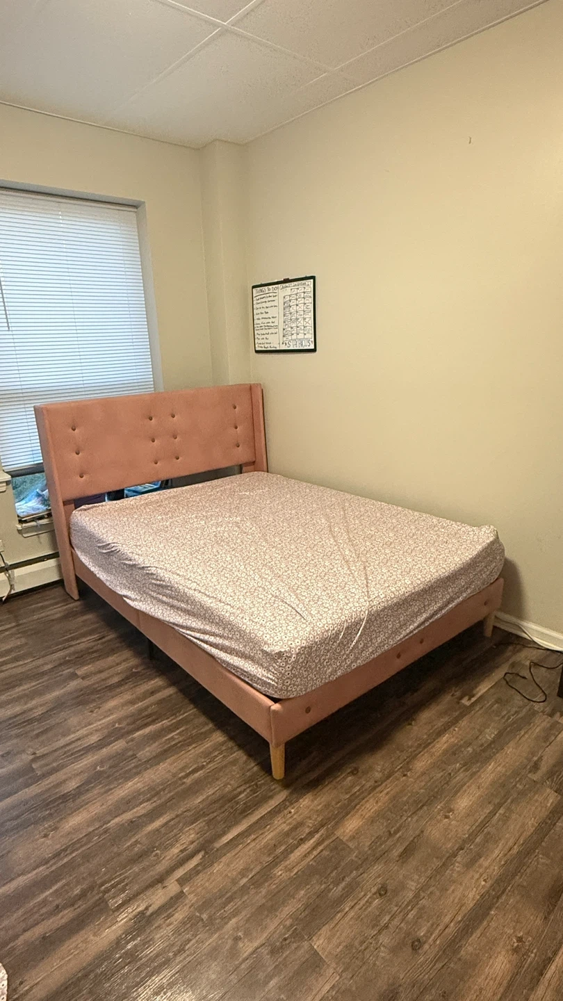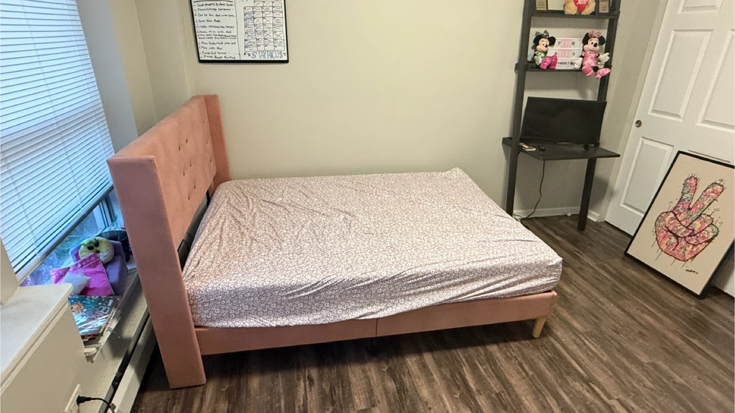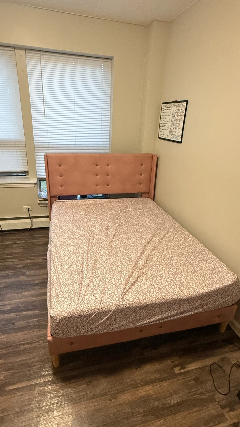 Selling a pink upholstered bed frame. It's in great condition and ready for a new home! Perfect for adding a touch of color to your bedroom with mattress