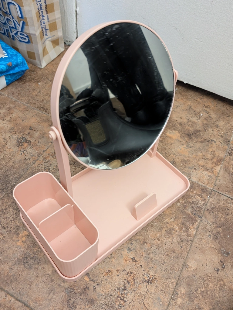 Selling a cute pink vanity mirror with a built-in organizer! It's perfect for keeping your makeup and accessories tidy. The mirror is in great condition and would look lovely on any vanity or dresser.