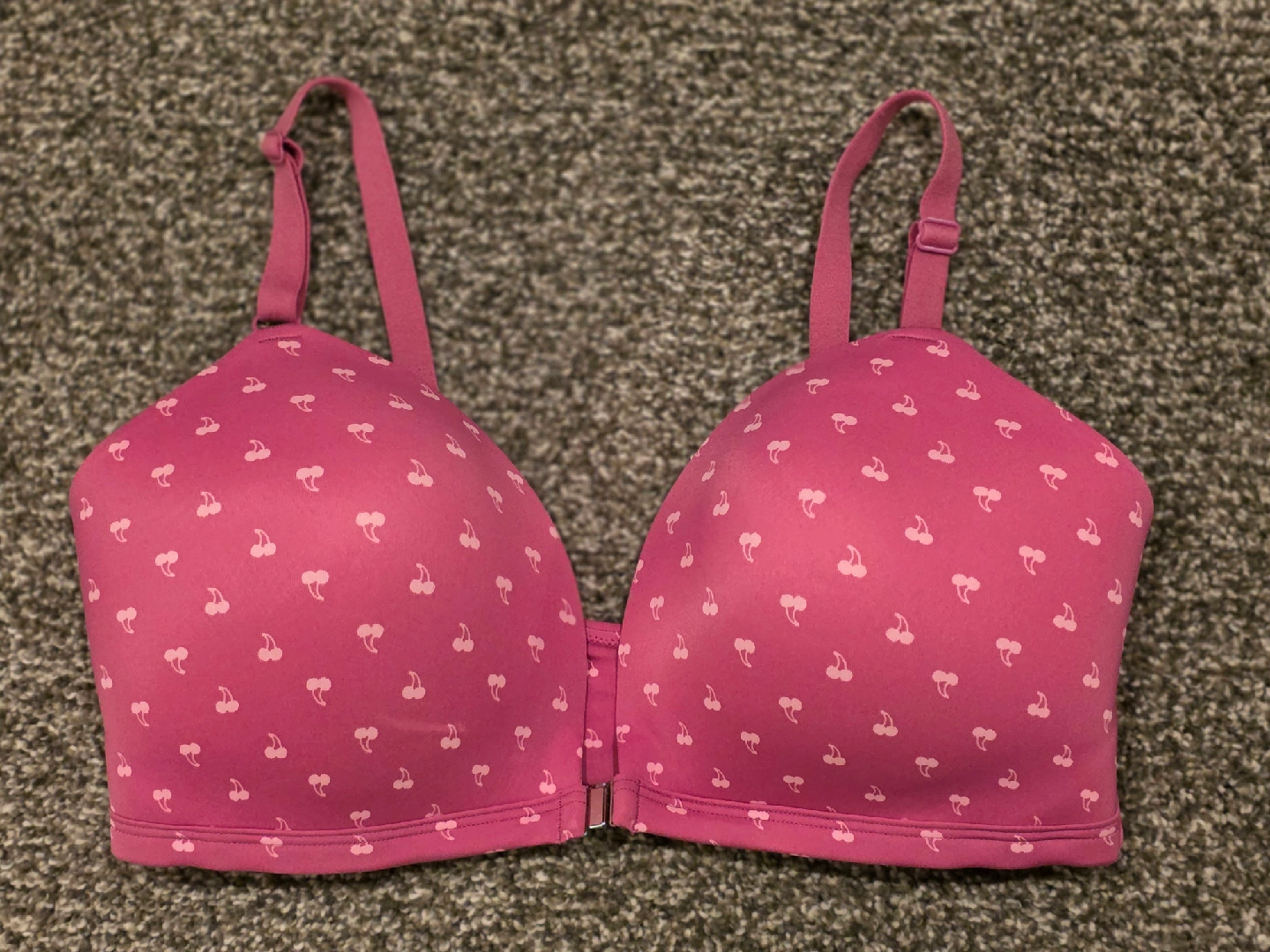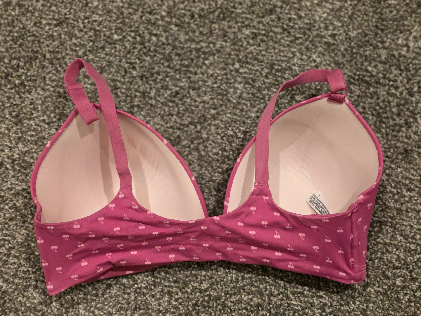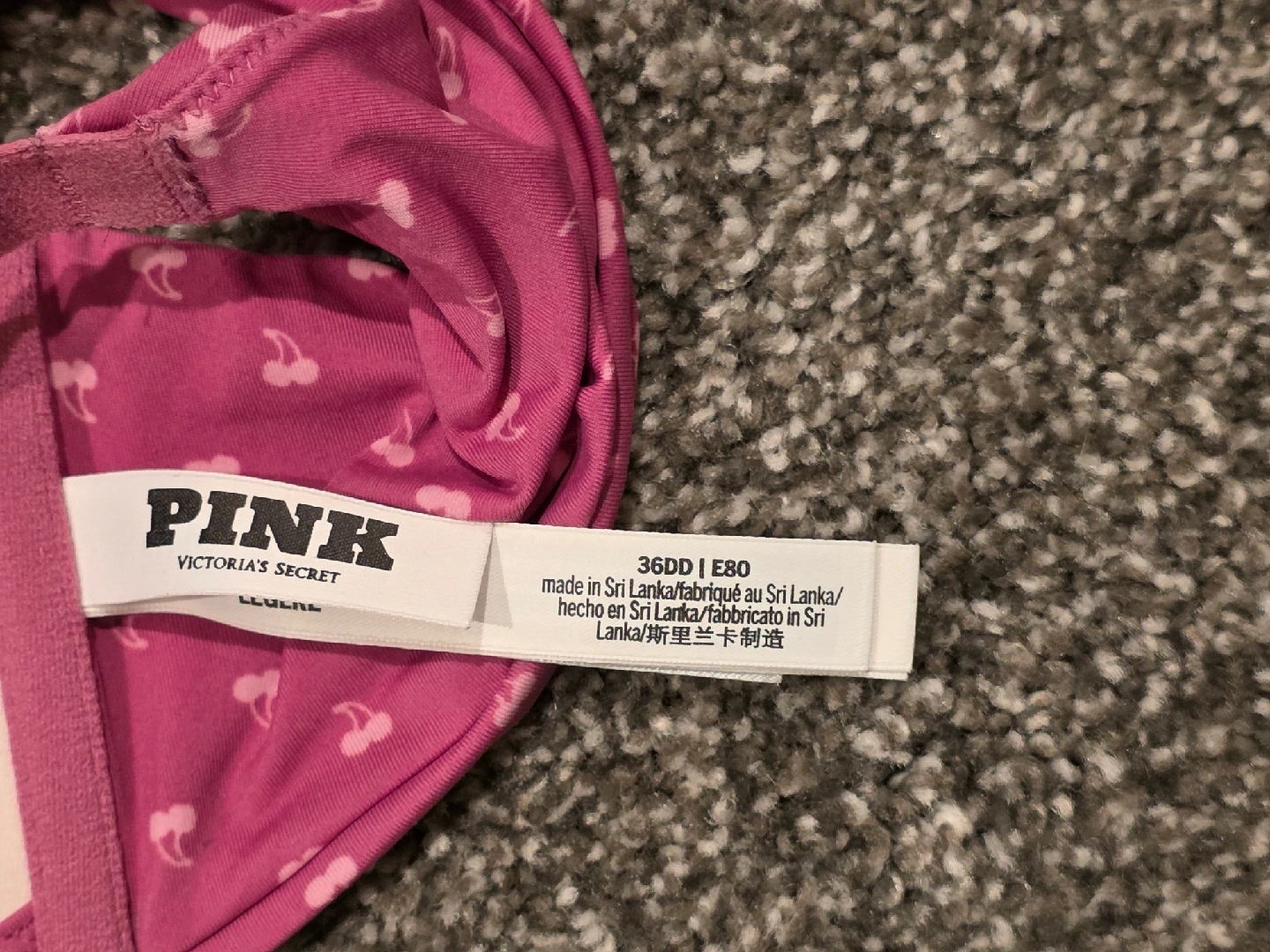 Selling a PINK Victoria's Secret bra in size 36DD! It's a cute pink color with a cherry pattern. The bra is made in Sri Lanka. Pick up in Naperville near naper blvd and 87th street or near downtown Naperville off of Chicago and Charles