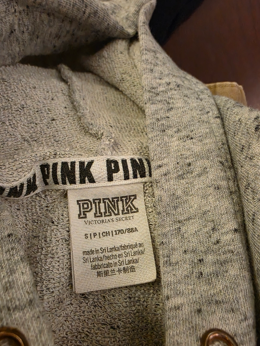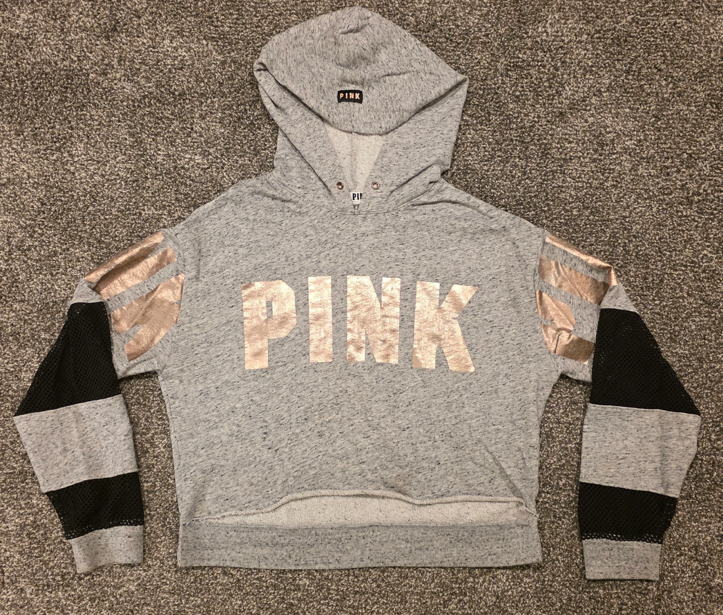 Selling a PINK Victoria's Secret hoodie in a heathered gray color. It features the PINK logo across the front in a metallic rose gold color. The sleeves have a unique design with metallic rose gold writing and black mesh detailing. Size is S (Small). Missing drawstring. Pick up in Naperville near naper blvd and 87th street or near downtown Naperville off of Chicago and Charles