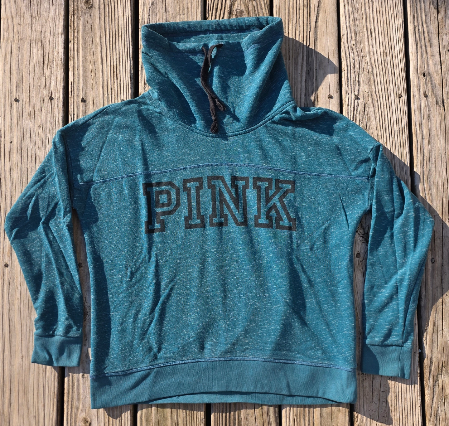 Here's a comfy teal cowl neck pullover from PINK Victoria's Secret! It's a size large and made from 72% cotton and 28% polyester. Perfect for cozy days! Pick up in Naperville near naper blvd and 87th street or near downtown Naperville off of Chicago and Charles