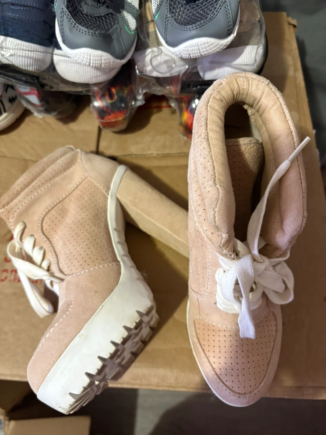 131These are a pair of cute pink wedge heel ankle boots! They have white laces and a platform wedge heel. Perfect for adding a little height and style to your outfit