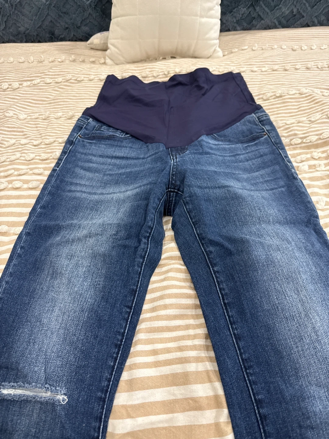 15Selling a pair of PinkBlush maternity jeans in size 28! They are made of 98% cotton and 2% spandex. The jeans have a distressed detail on one knee. Please see pictures for details!