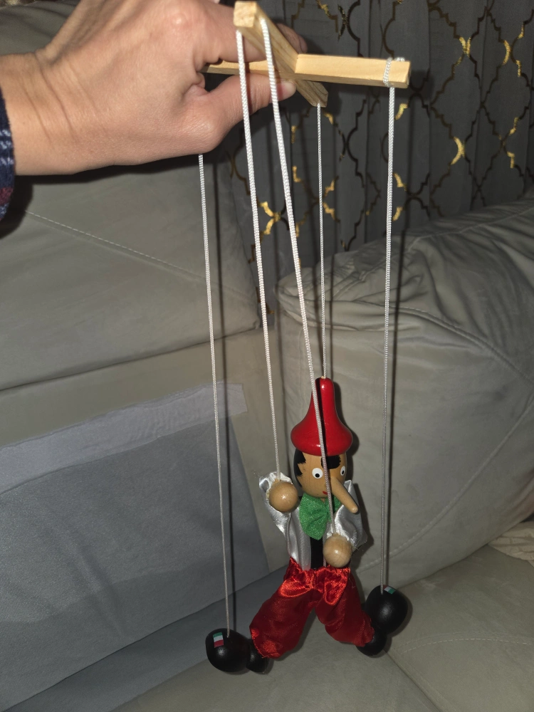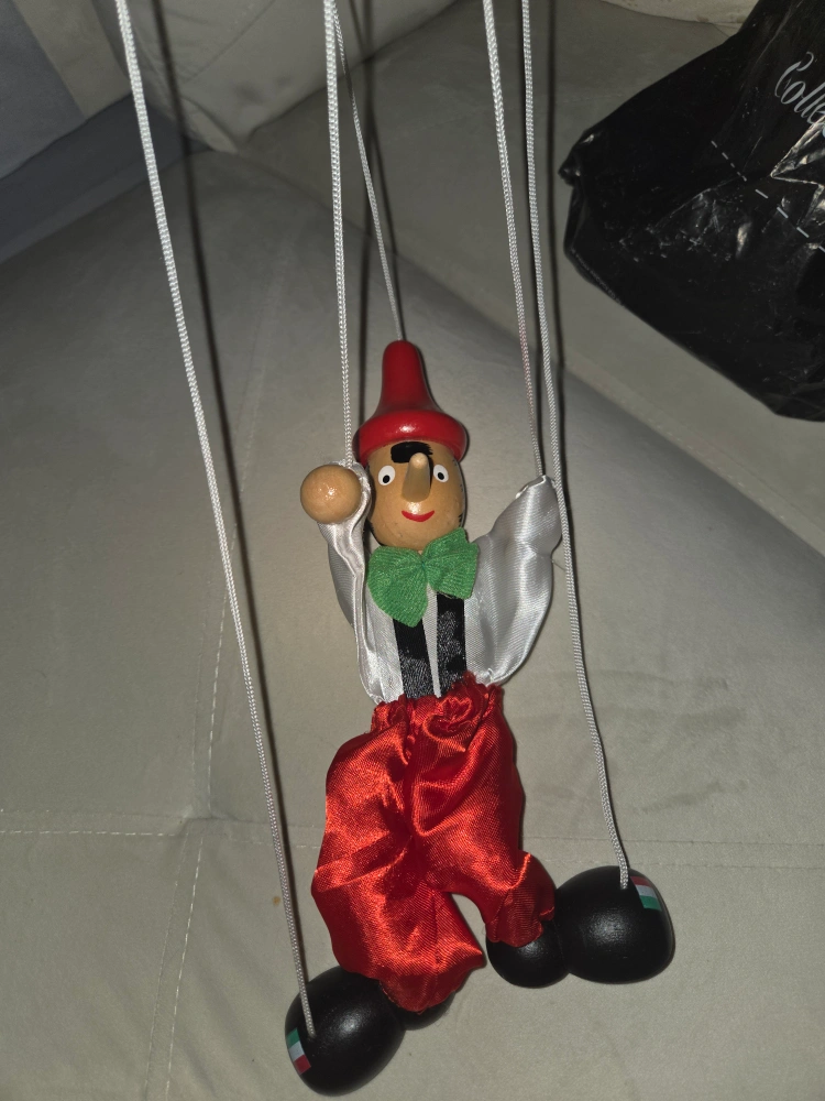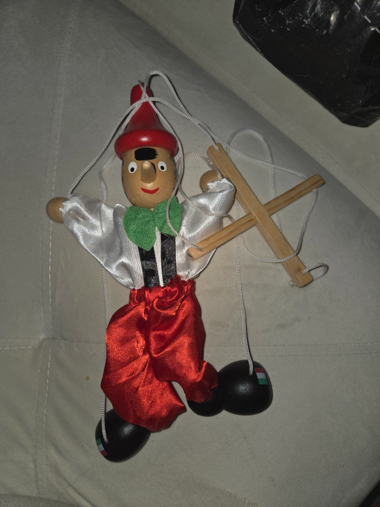 0Here's a cute Pinocchio marionette puppet! It's made of wood and has a classic design. Perfect for kids or collectors, handmade in Italy. Brought back from a trip in Italy and never got around to using it. Prestine condition.