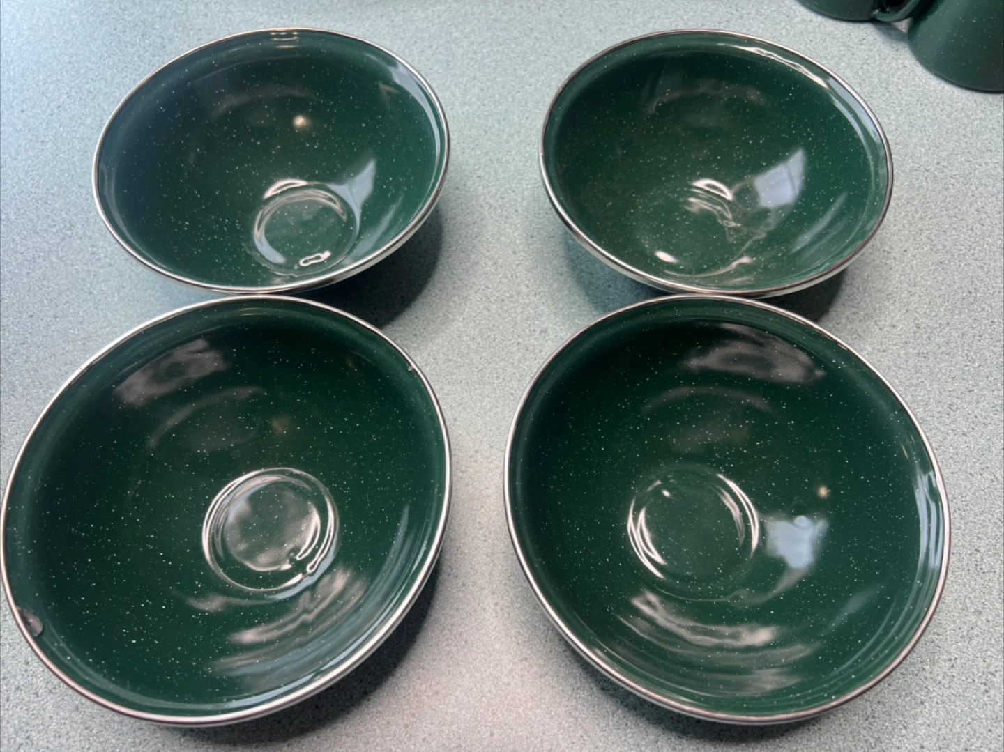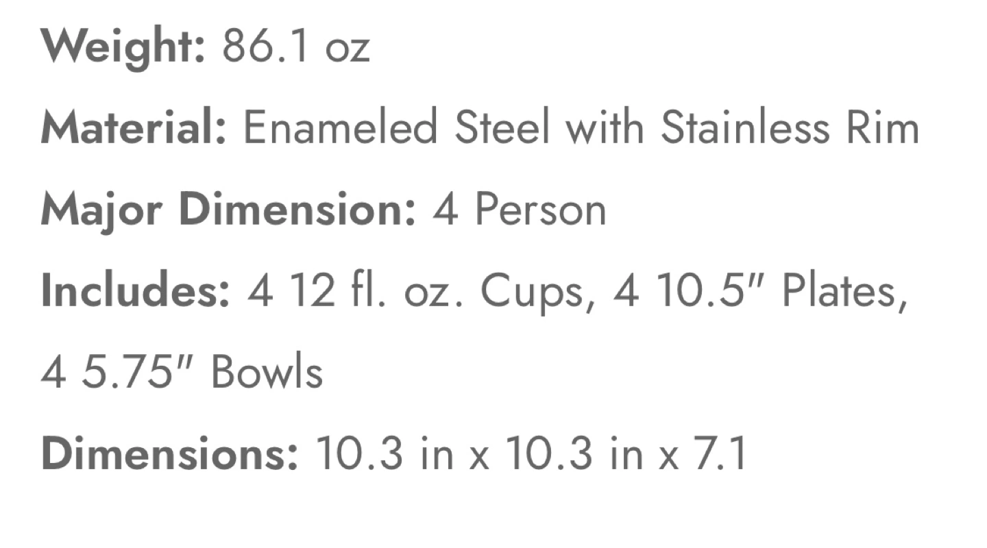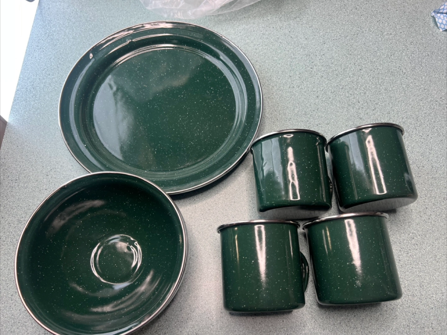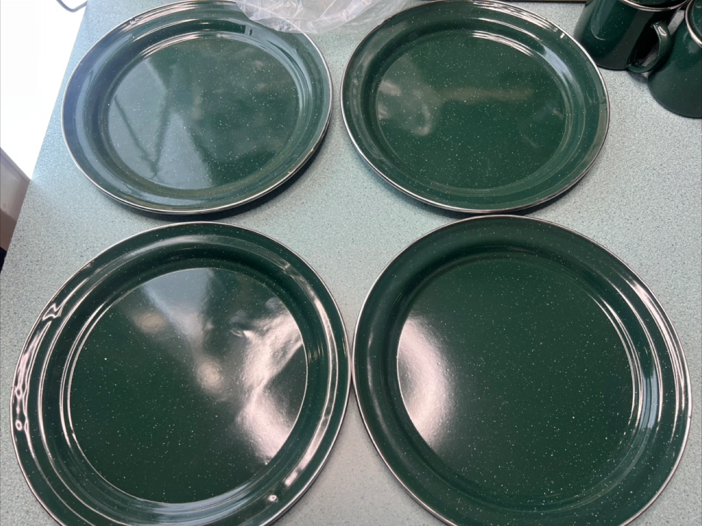 73Dark green enamelware set. Includes four plates, four bowls, and four mugs. Perfect for camping or picnics.