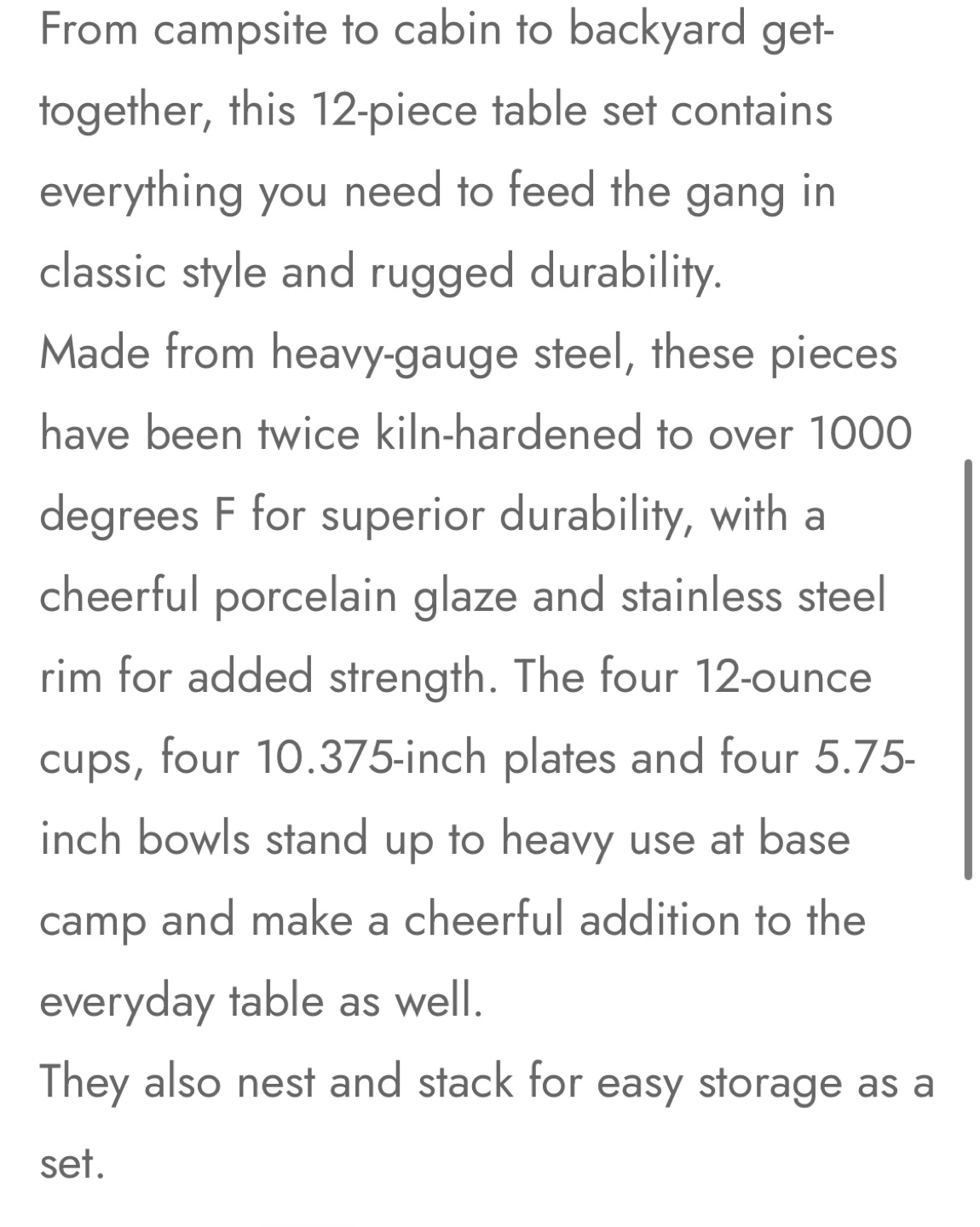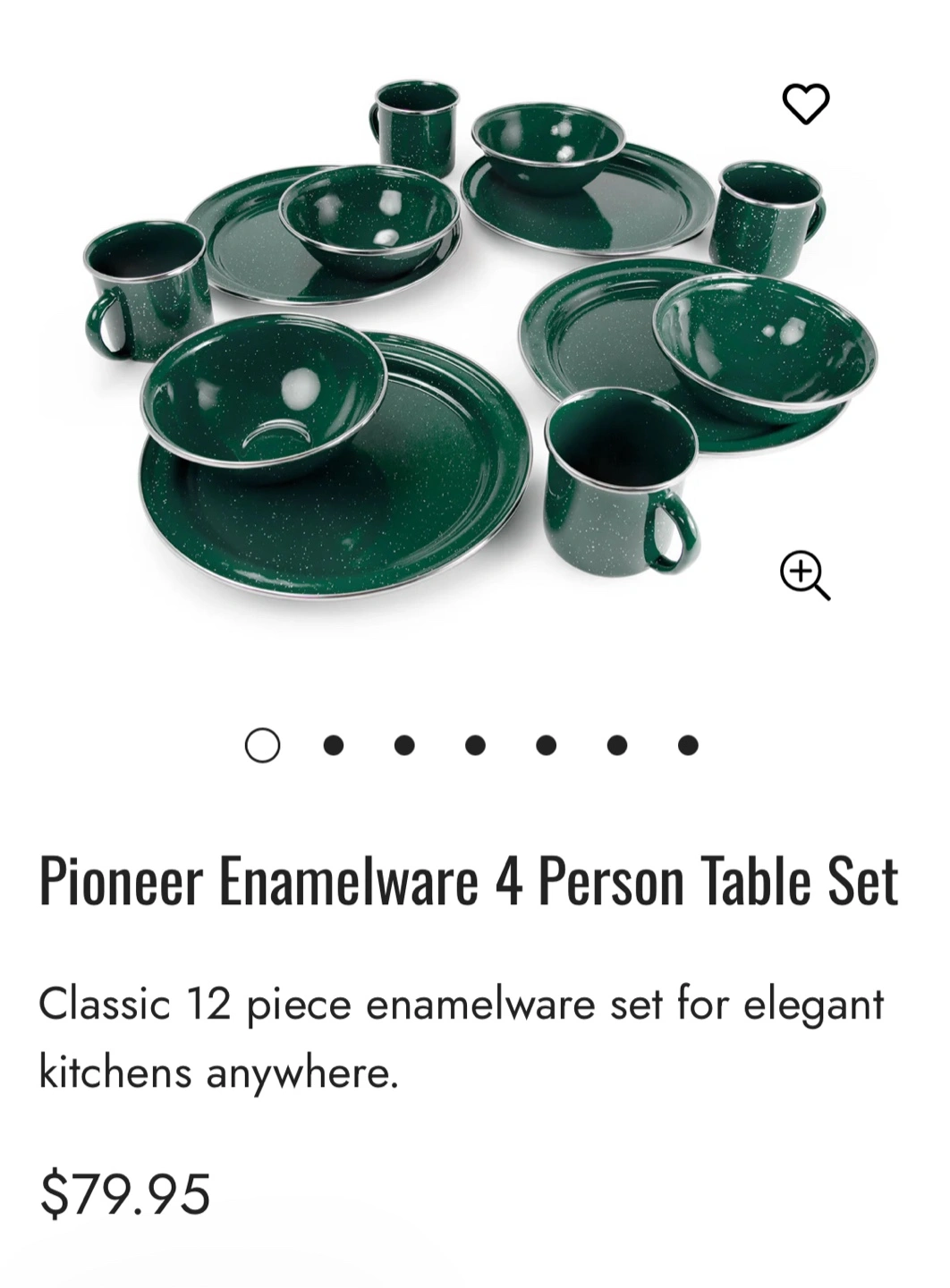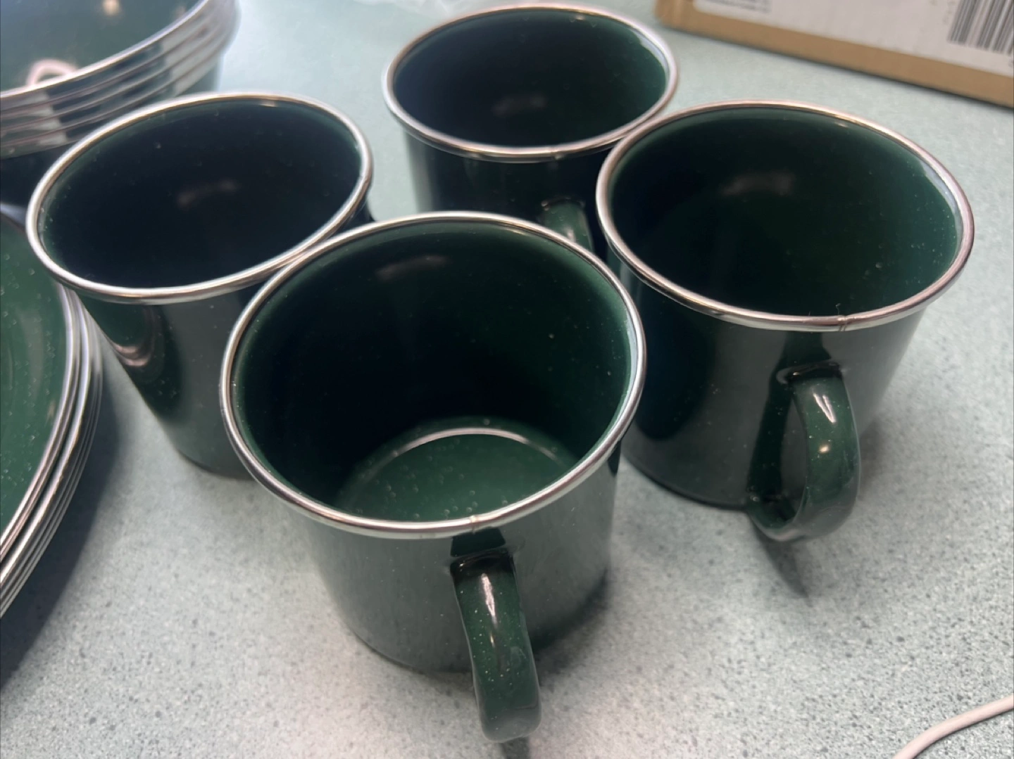 73Dark green enamelware set. Includes four plates, four bowls, and four mugs. Perfect for camping or picnics.