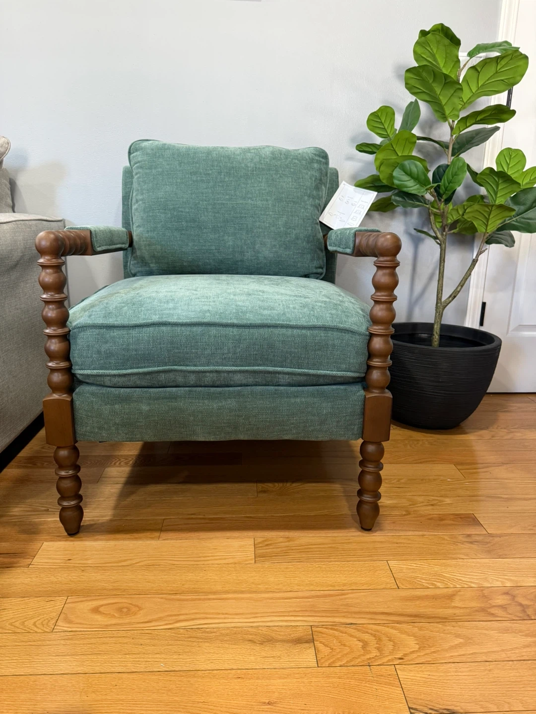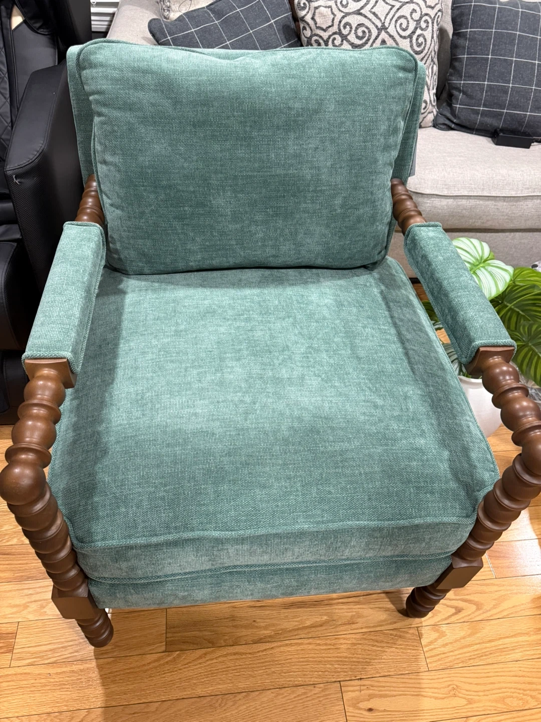 Selling a Pioneer Woman Harper Spindle Accent Chair in a lovely jade fabric upholstery! It's in great condition and ready to add a touch of charm to your space. Originally bought for $198