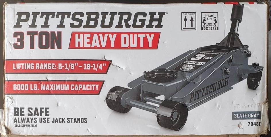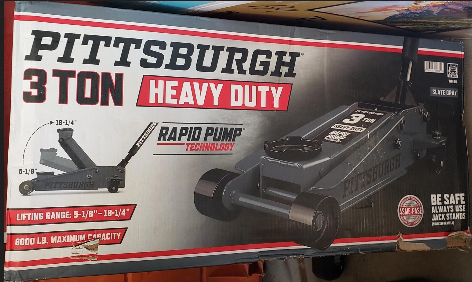 20% DISCOUNT NEW never opened, Will deliver for free within 25-50 miles, contact us This 3 Ton Car Jack gets vehicles almost two feet off the ground. A protective foam bumper on the jack handle protects vehicle surfaces from damage. Dual-piston RAPID PUMP® technology lifts most work loads in just 3-1/2 pumps. Super-tough precision-welded construction with an industrial grade finish RAPID PUMP exclusive dual parallel-pump system lifts with far fewer pumps Universal joint release provides precise load control in any handle position Extra-wide steel casters for stability Engineered to comply with ASME-PASE industry standards Here is the exact same jack in action https://youtu.be/pgGwT6bXfvo