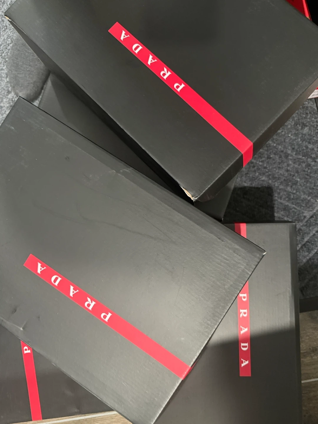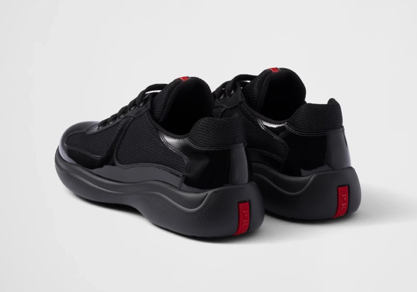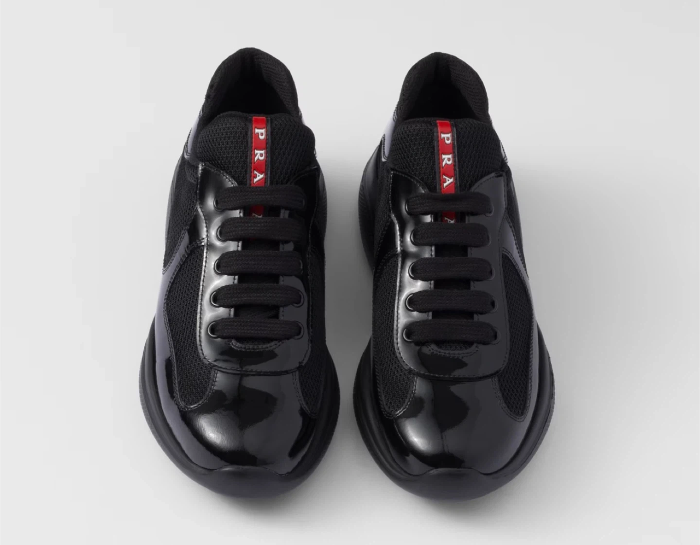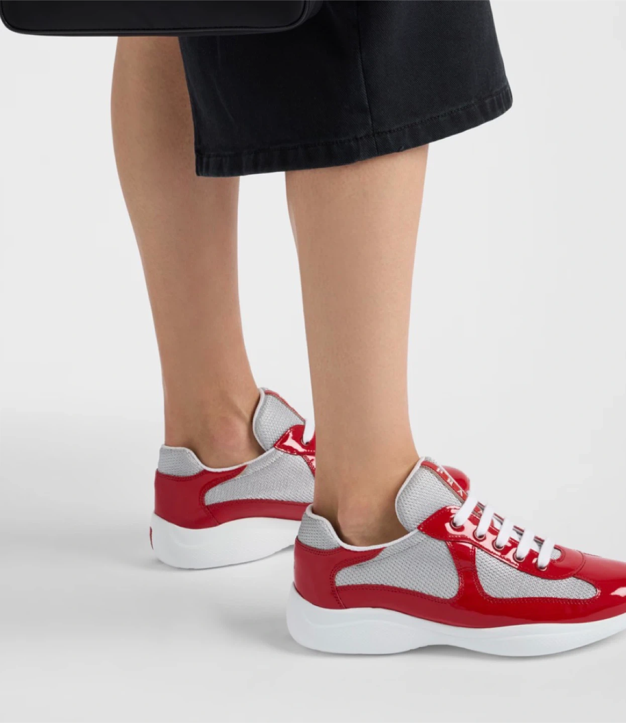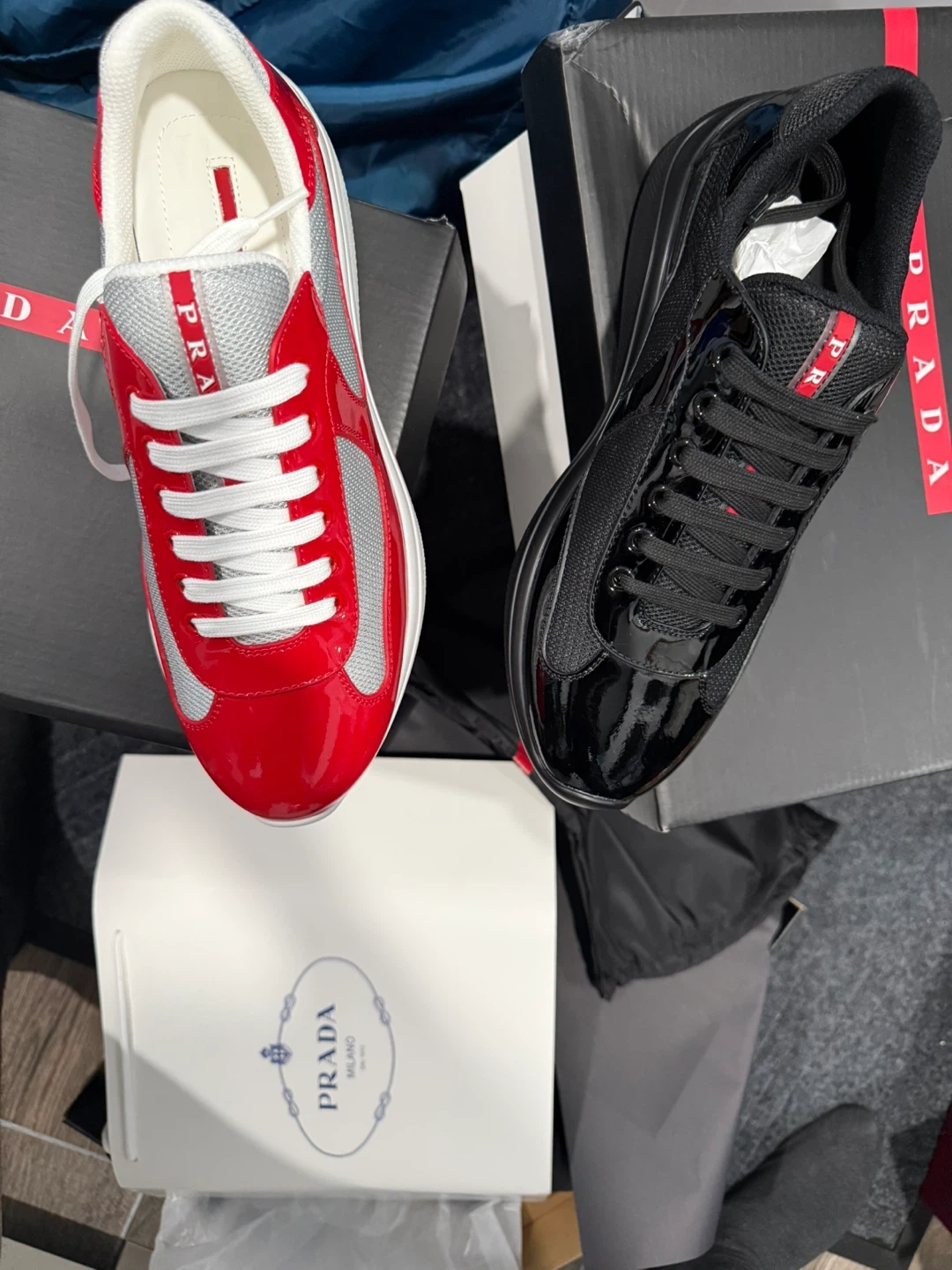 Authentic Prada sneakers available in red and black. Includes original boxes and authentication certificate. Mesh and patent leather construction.
