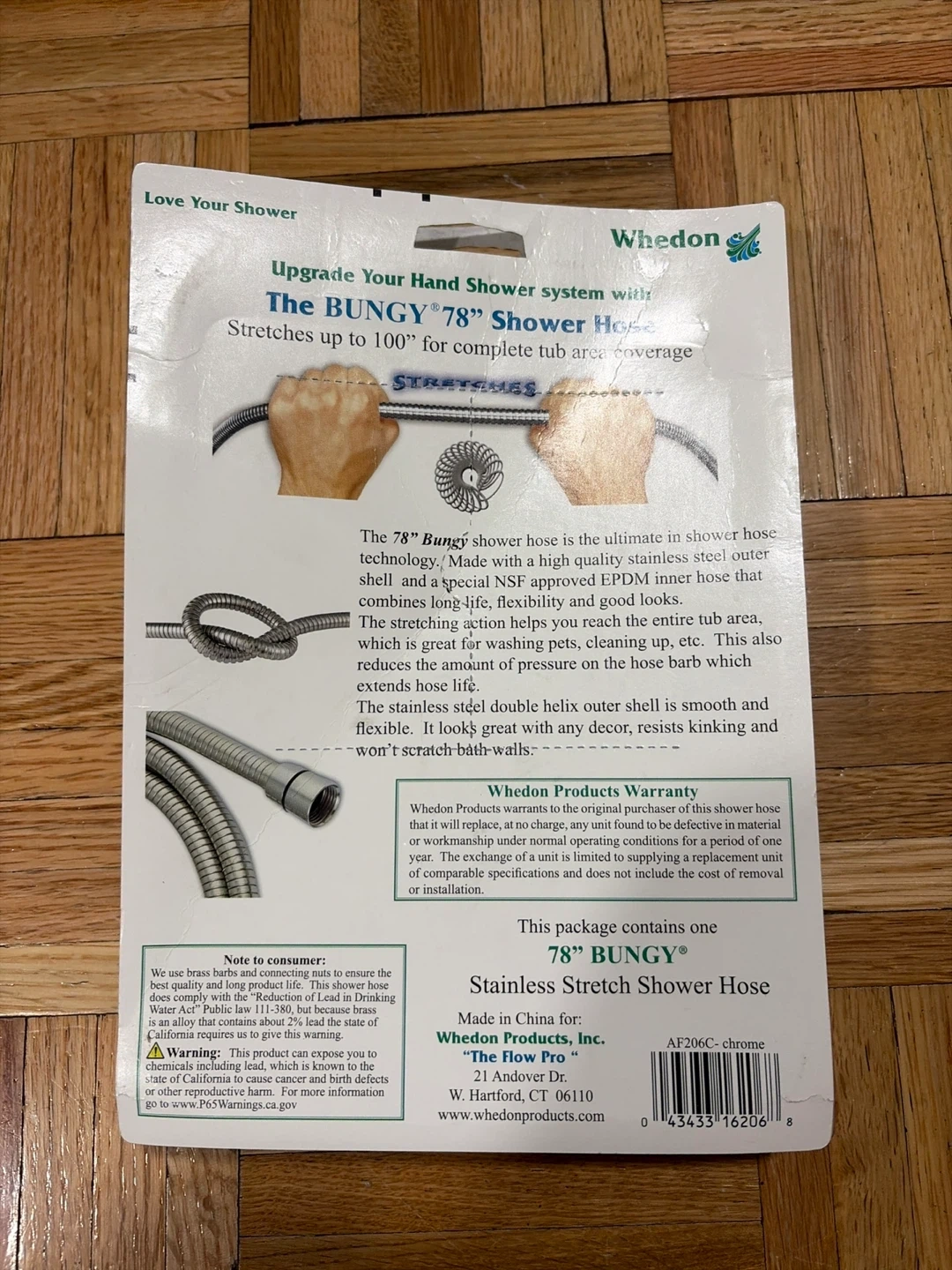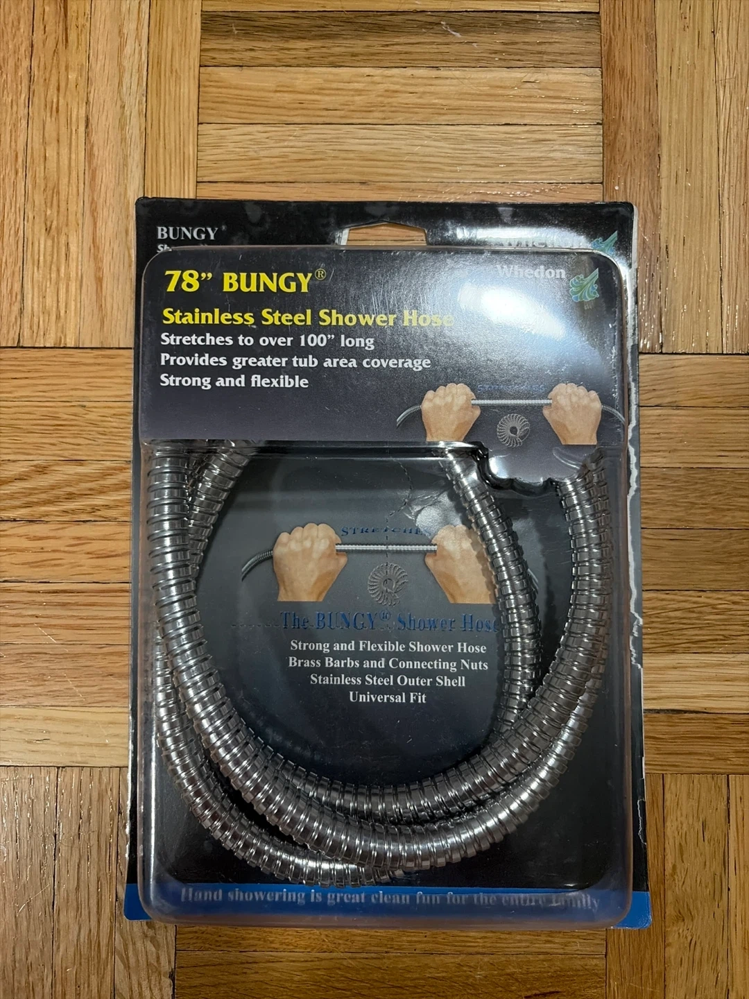 This is Whedon Products' "The BUNGY" stainless steel shower hose. It stretches for greater tub area coverage. It's strong and flexible with a stainless steel outer shell. The hose itself is made with a high quality, stainless steel outer shell and a special NSF approved EPDM inner hose. Brass barbs and connecting nuts.