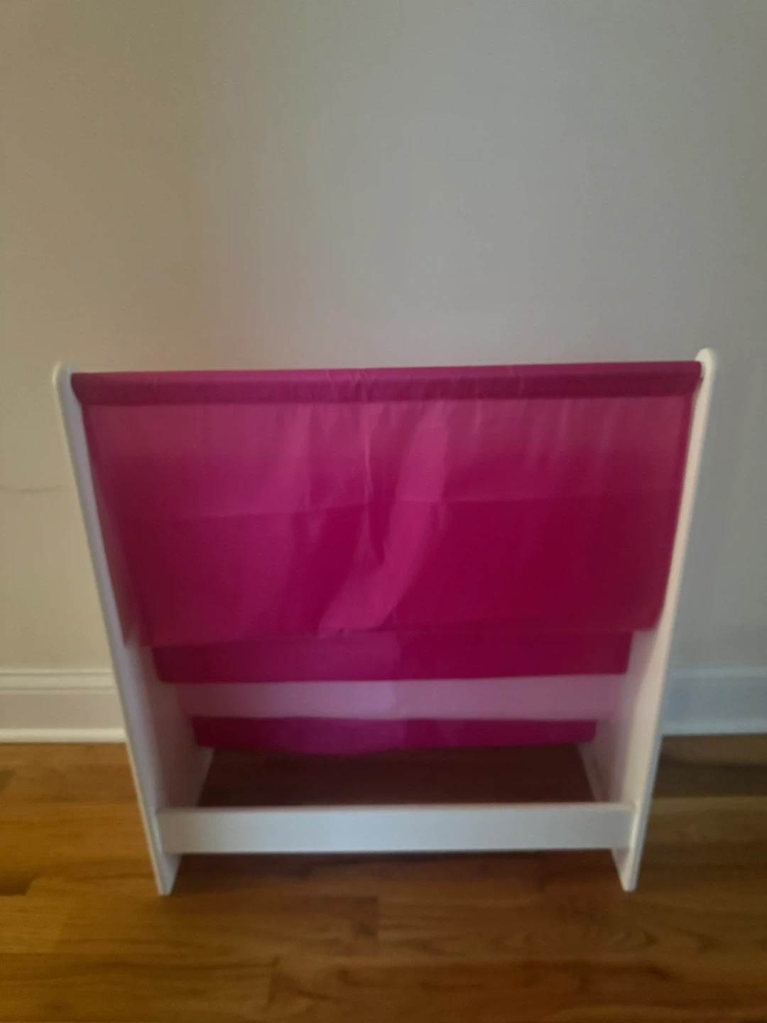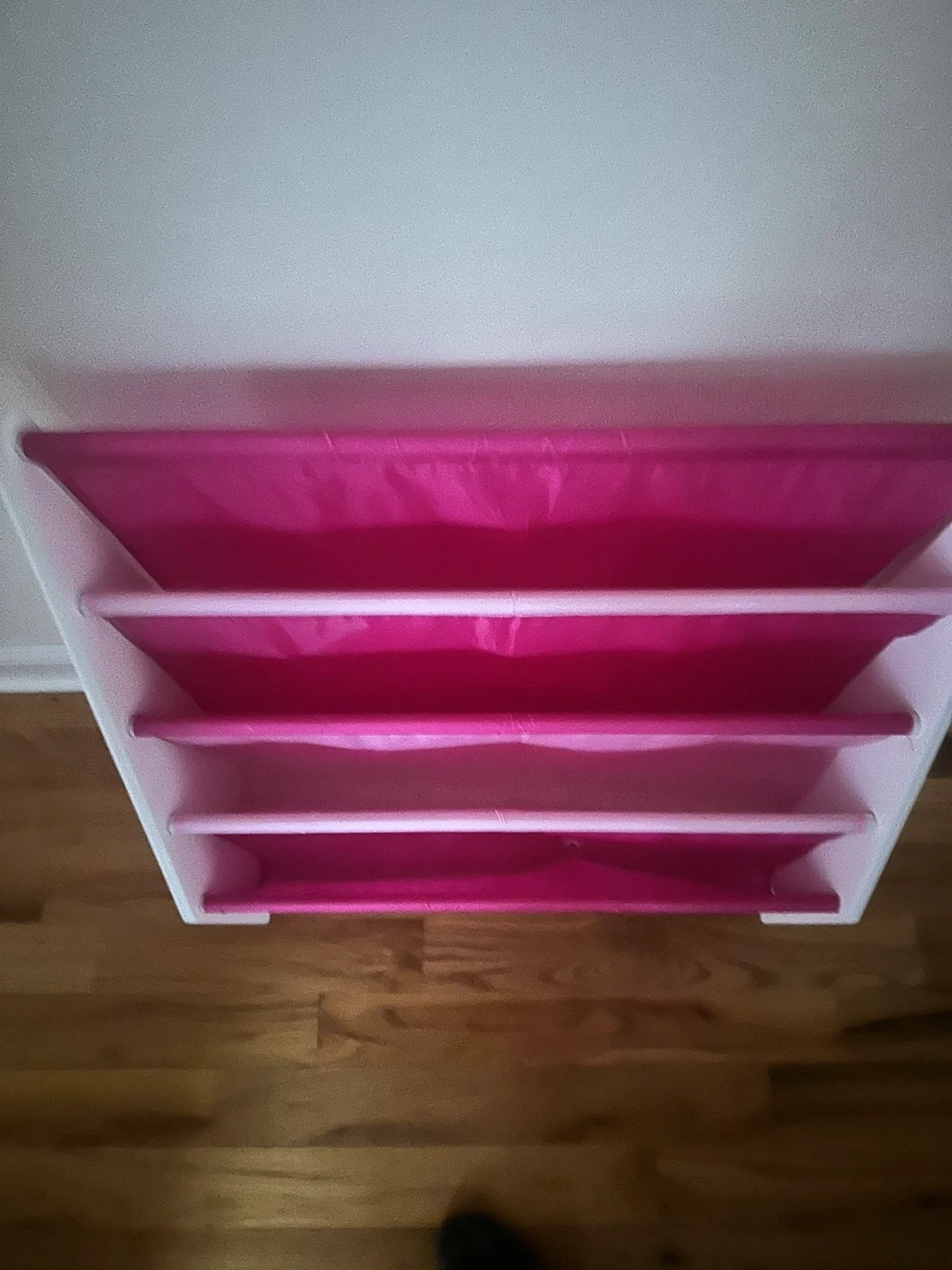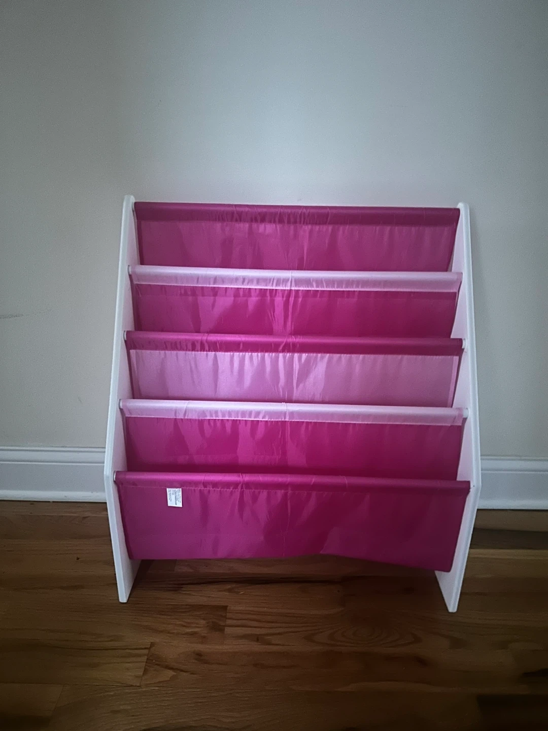 This kids' book display shelf features four fabric tiers for storing books. The frame is white with pink fabric pockets. It's a great way to organize children's books!
