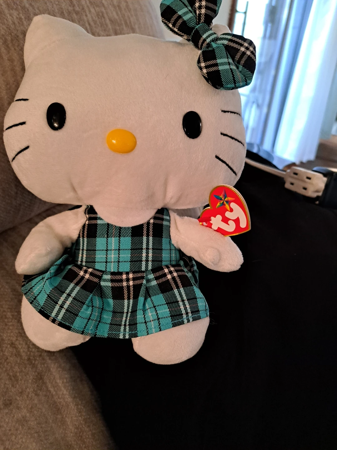 This is a Hello Kitty plush toy. It's white with a yellow nose and black eyes. The plush wears a blue and black plaid dress and a matching bow. Includes original tags.
