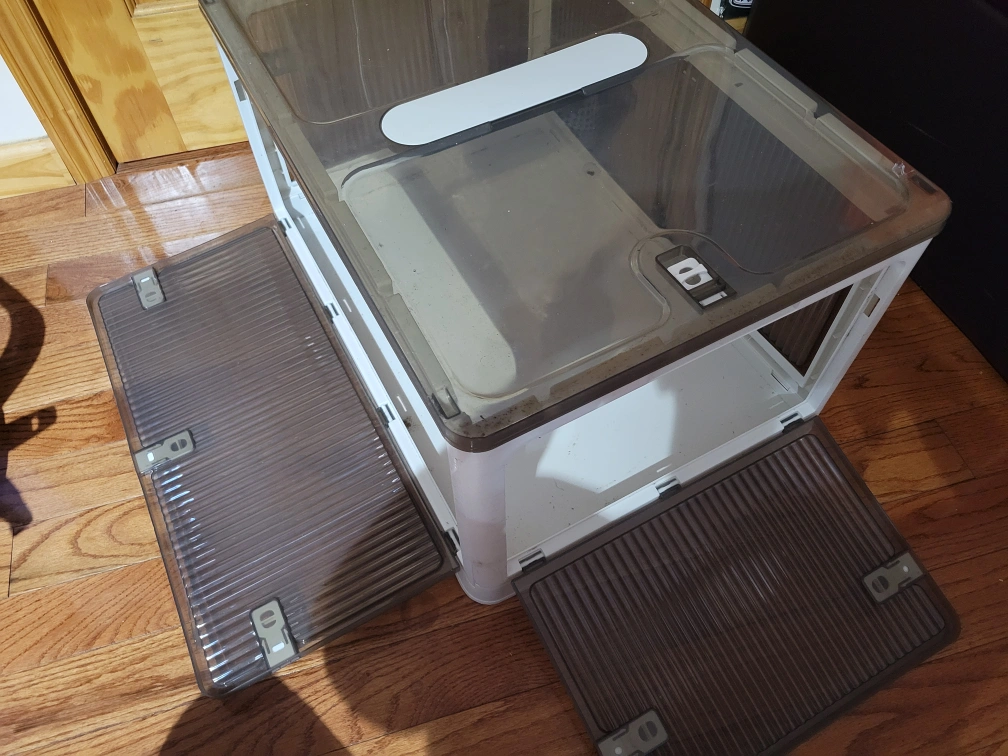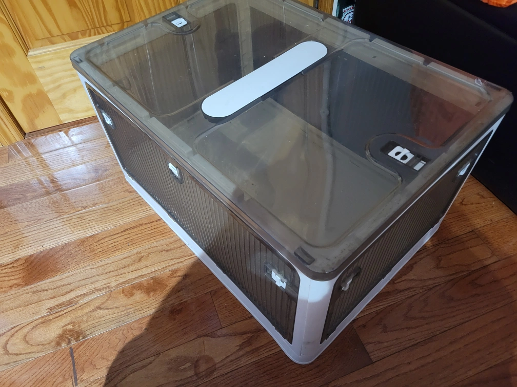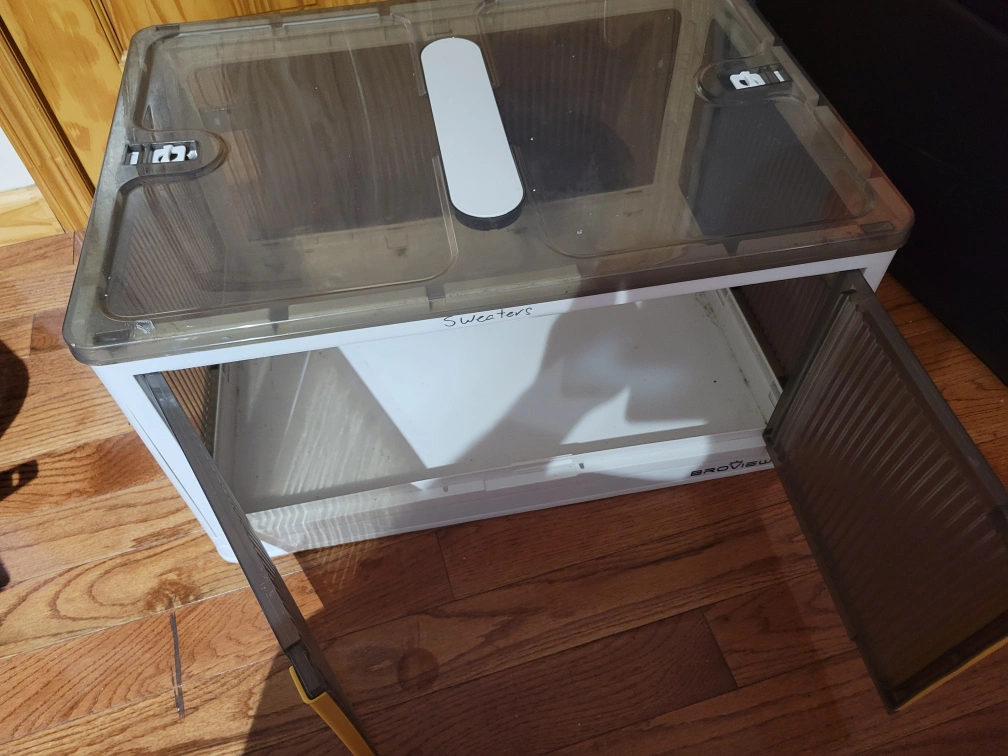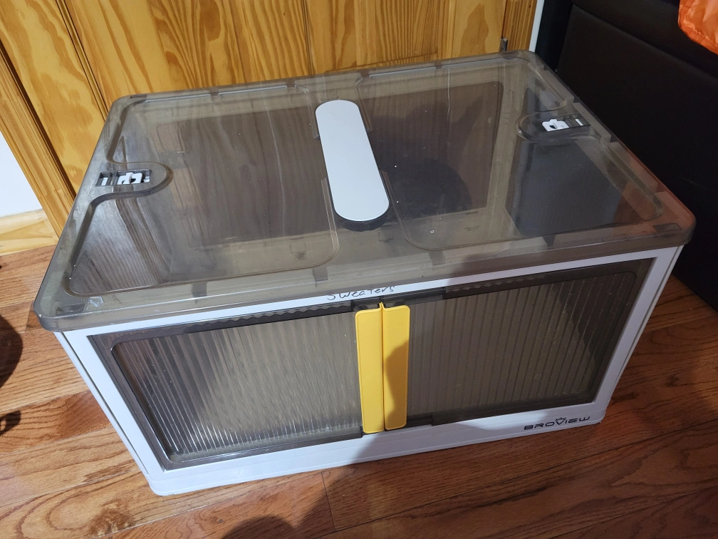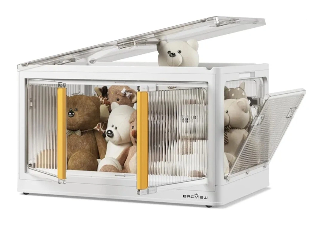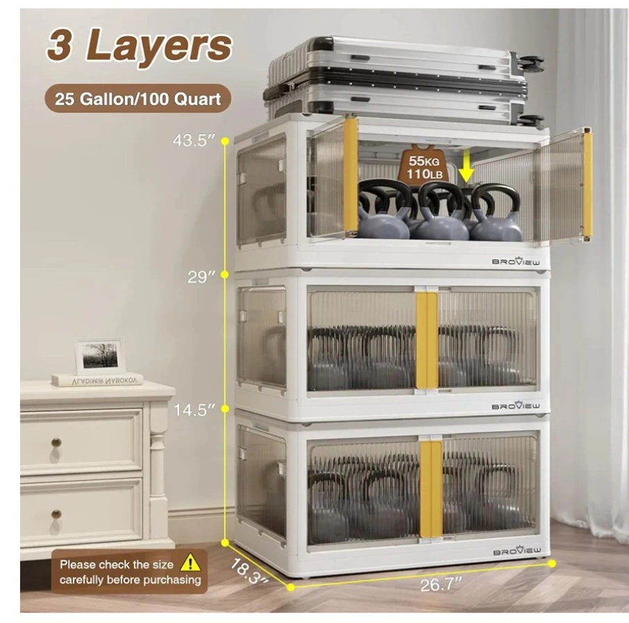 92Just ONE bin!! Brand: BROVIEW Material: Polyethylene Special Feature: Stackable, Foldable, Collapsible, Lockable, Wheeled Recommended Uses For ProductArts & Crafts, For Toys, snack, Clothes, blanket, Indoor, Books, Christmas Ornaments, food Assembled large storage box measures 26.38'' (Lengthen) x 18.5'' (Widen) x 14.57''H (3.85"Folded). Maximum load capacity is 25Gal Your storage space will be More Sufficient and Flexible! Made of premium environmentally friendly materials, sturdy and durable, won't break easily. Max bearing weight is 200lb/50kg. Broview's New Plastic Five-doors Storage Bins with latching lids have the added features of side and rear openings in addition to the basic front double-door opening and top cover opening! With the all-around opening design, even if the entire storage cabinet is stuffed, items can be easily taken out! All doors are equipped with secure locks. Collapsible storage bin require no tools or complicated installation. It only takes 10 seconds to unfold into complete translucent storage container. Only 3.85'' thick after folding, the best choice for storage people! When not in use, storage organizer can be stored under the bed, in the closet, or in a small corner of the bedroom, and also in the car trunk when traveling outdoors. With a spacious capacity, odorless, semi-transparent design, and sturdy construction, these organization boxes are perfect for all your storage needs as a desk organizer, bathroom organizer, kitchen organization, closet organizer, dog food storage container, laundry room organizing, toy storage, car organizer, under bed storage containers, bedroom storage, snack organizer, book bins, outdoor storage box, hat storage, etc.