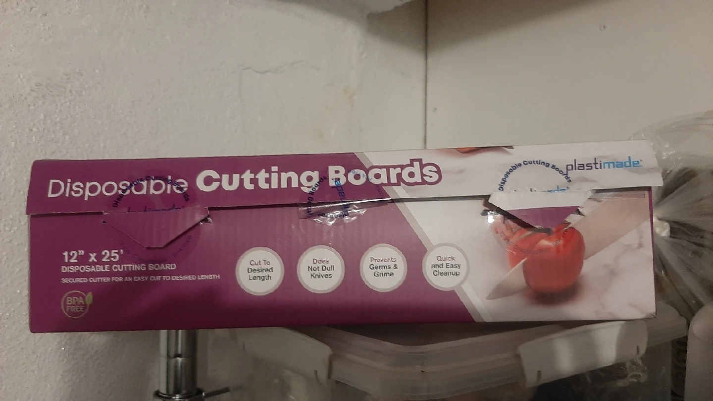 Selling a roll of Plastimade Disposable Cutting Boards. It's 12 inches by 25 feet. These cutting boards can be cut to the desired length and won't dull your knives. They also prevent germs and grime, and cleanup is quick and easy!