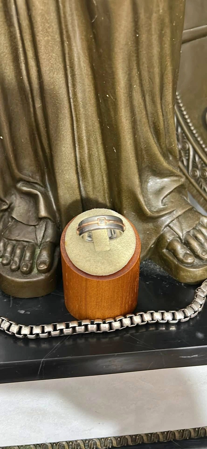 15I make this Timeless and traditional, these bands are available in different widths and finishes. This on particular is made of platinum and rose gold with 4 lab grown princess cut diamonds . Available in other and other metals .