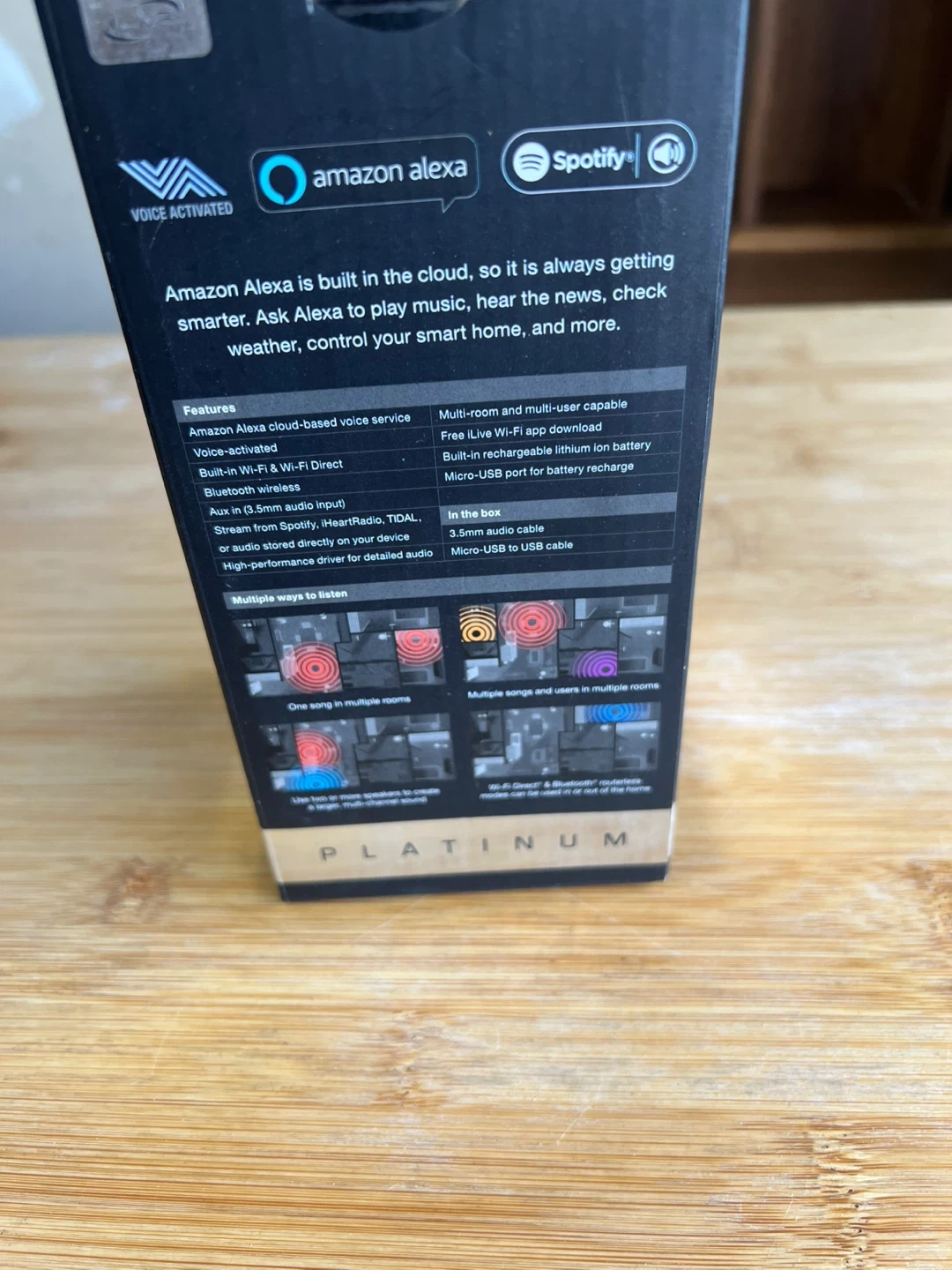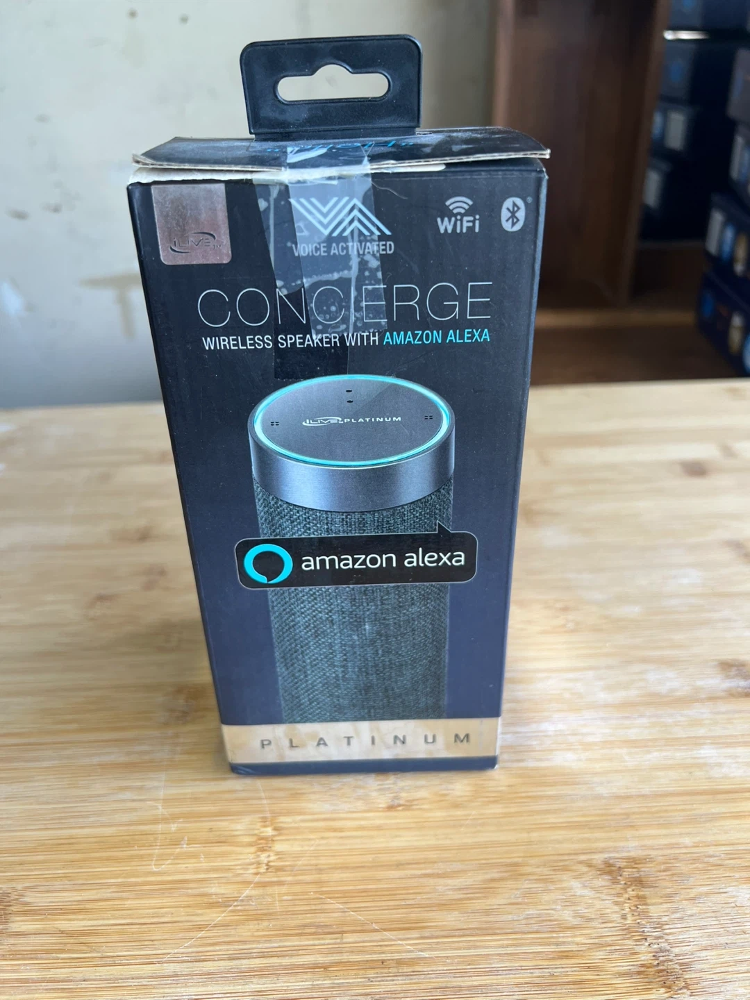 Selling a Platinum Concierge wireless speaker with Amazon Alexa. It features Amazon Alexa cloud-based voice service, voice activated, built-in Wi-Fi & Wi-Fi Direct, and Bluetooth wireless. It also has an aux in (3.5mm audio input) and can stream audio directly from iHeartRadio, TIDAL, or audio stored directly on your device. Included in the box: 3.5mm audio cable and micro-USB to USB cable