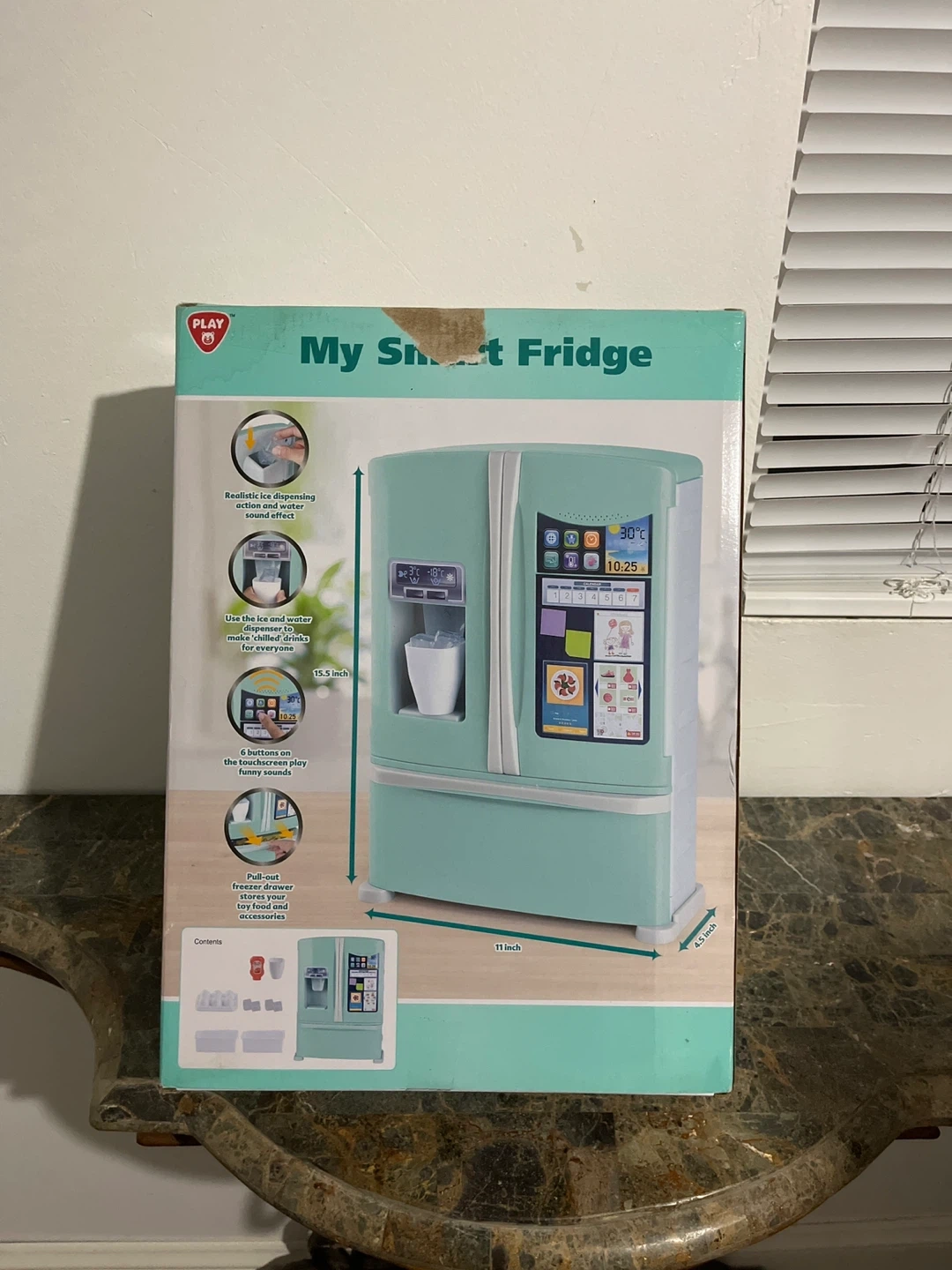 60Selling a Playgo My Smart Fridge toy! It's in great condition and comes with the box. This toy fridge features realistic ice dispensing action with water sound effects. It also has buttons on the fridge that make funny sounds! The box says it's for ages 3+