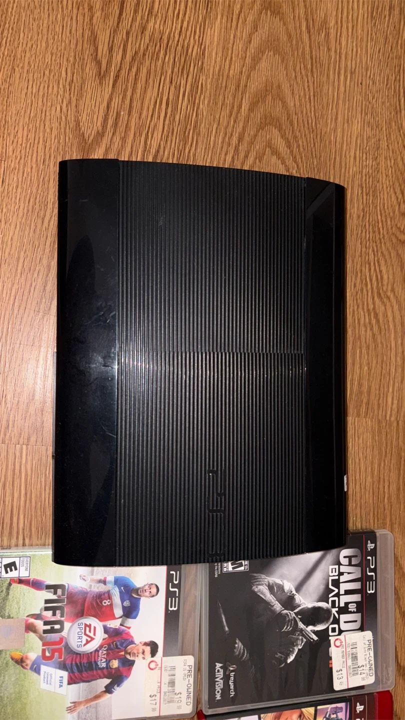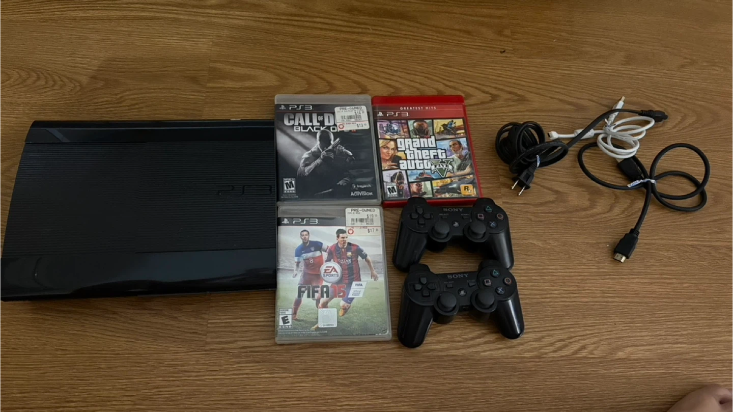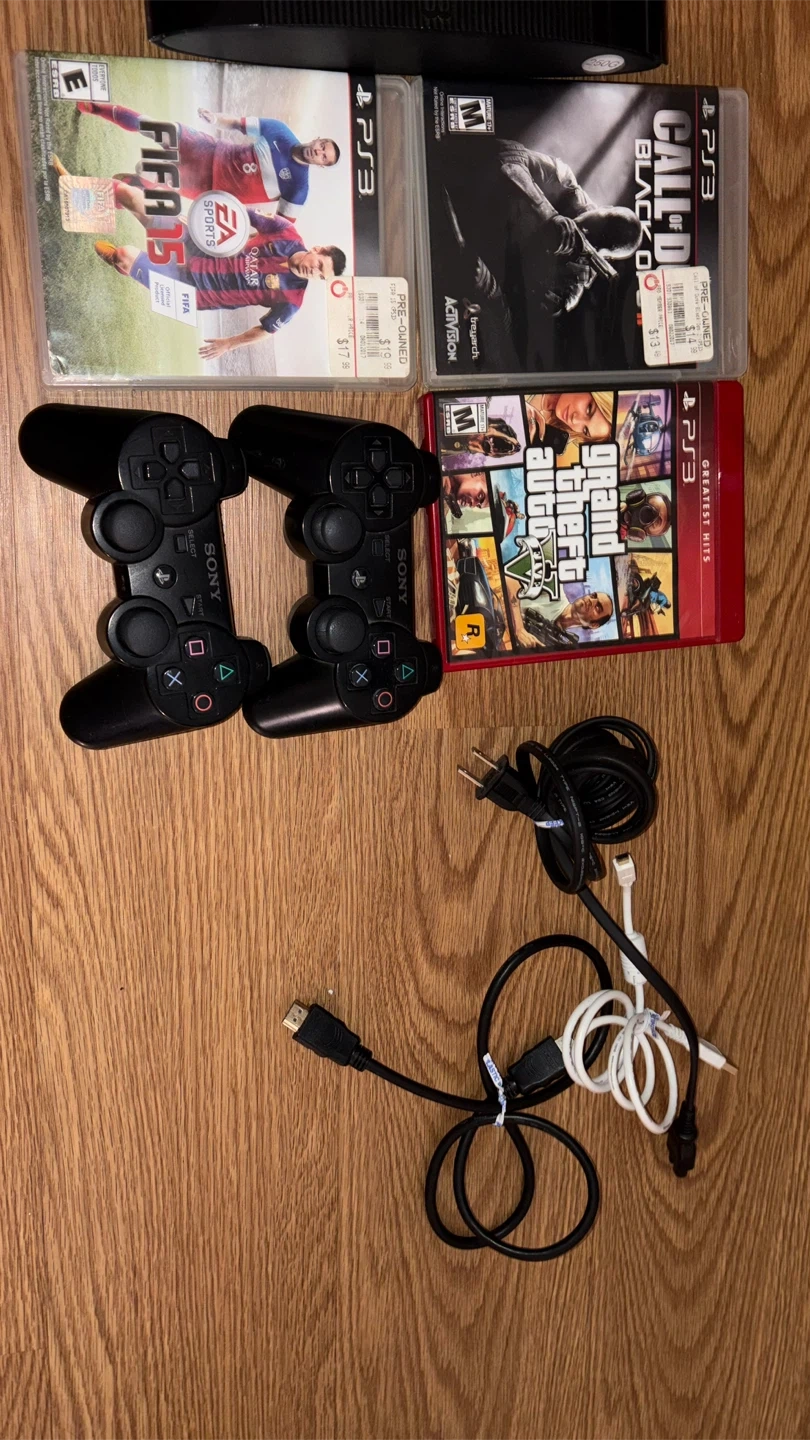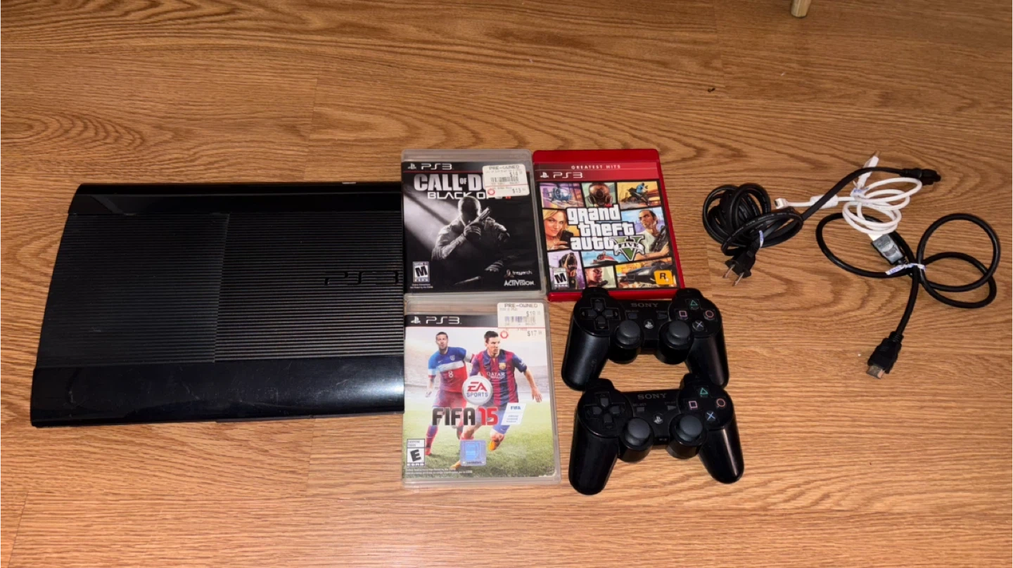 Selling a PlayStation 3 bundle! Includes the console in great condition, and three games: Call of Duty Black Ops, FIFA 15, and Grand Theft Auto V. Also comes with the necessary cables. There is also 2 controllers which unfortunately have messed up sensors but I don’t think that’s a hard fix.