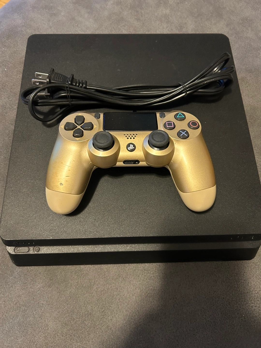 38A console with a controller and its power cord. Gold controller. A great way to unwind after a long day.
