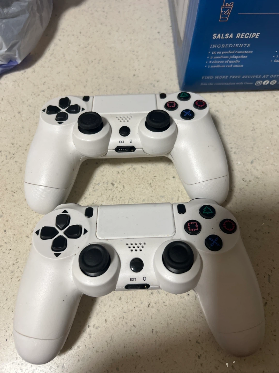 Selling two white PlayStation 4 DualShock 4 controllers. They are in good condition and ready for a new home!