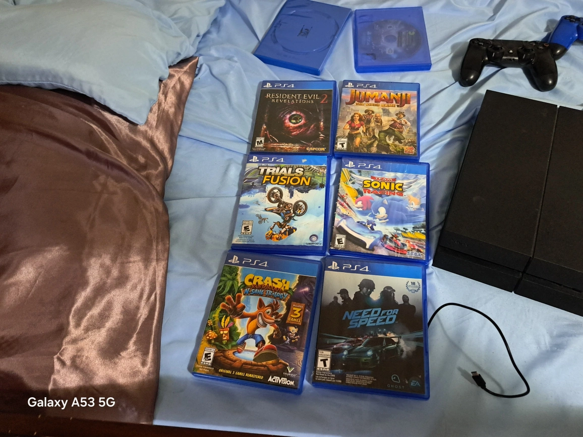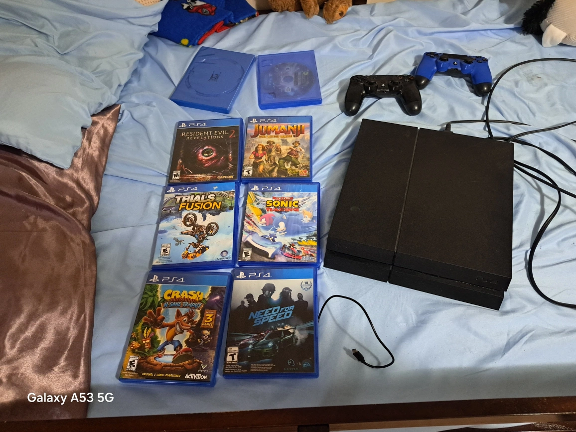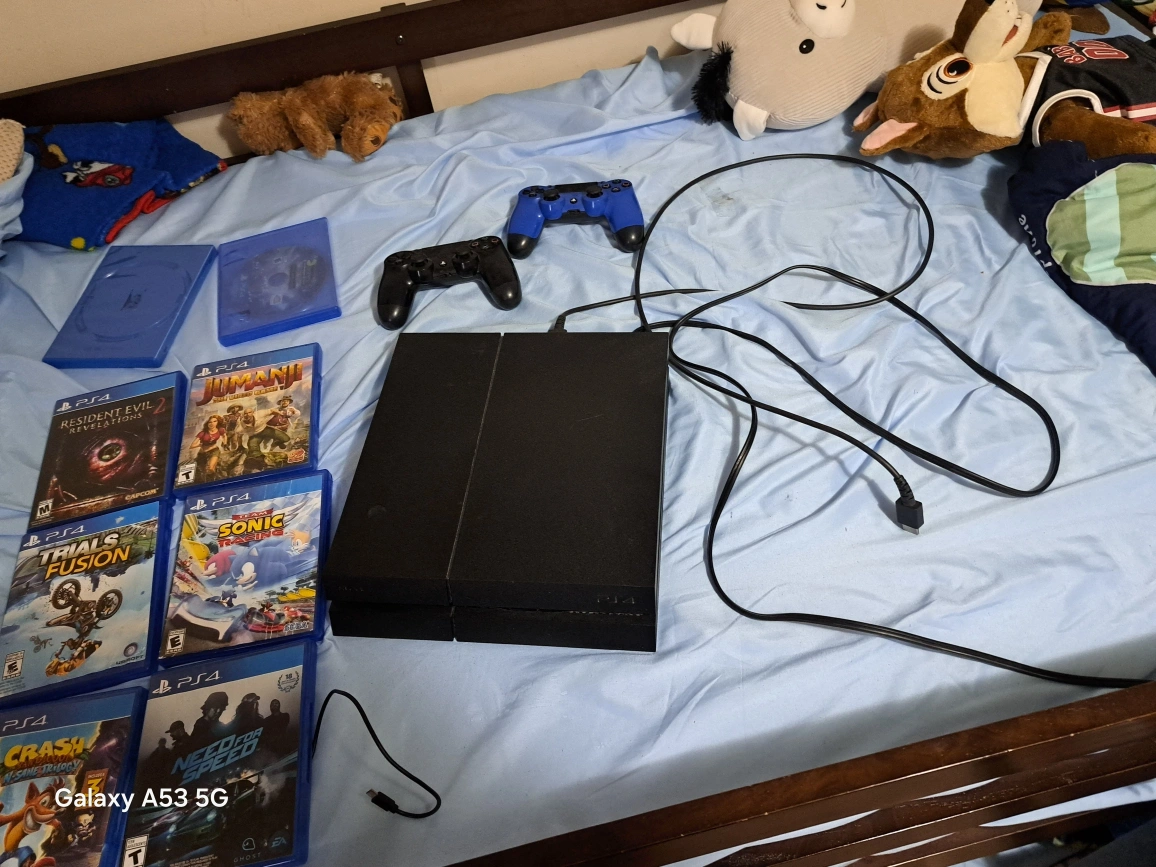 Selling a PlayStation 4 with several games and two controllers! Includes games like Resident Evil Revelations 2, Jumanji, Trials Fusion, Sonic Racing, Crash Bandicoot N. Sane Trilogy, and Need for Speed. Great for some fun!