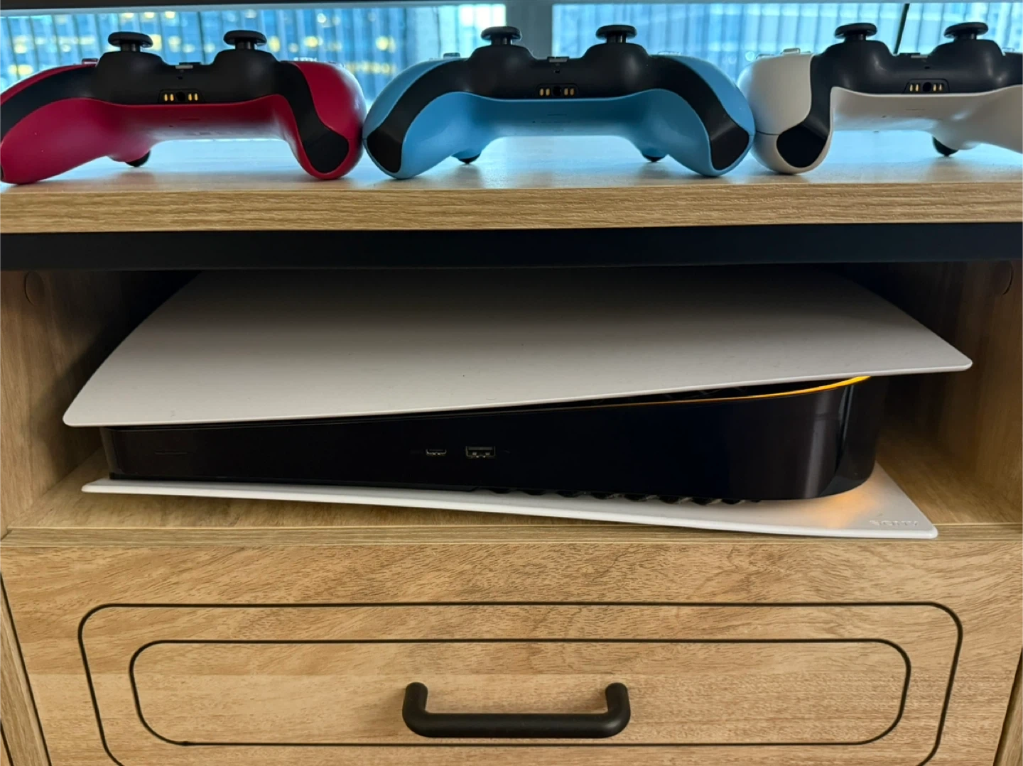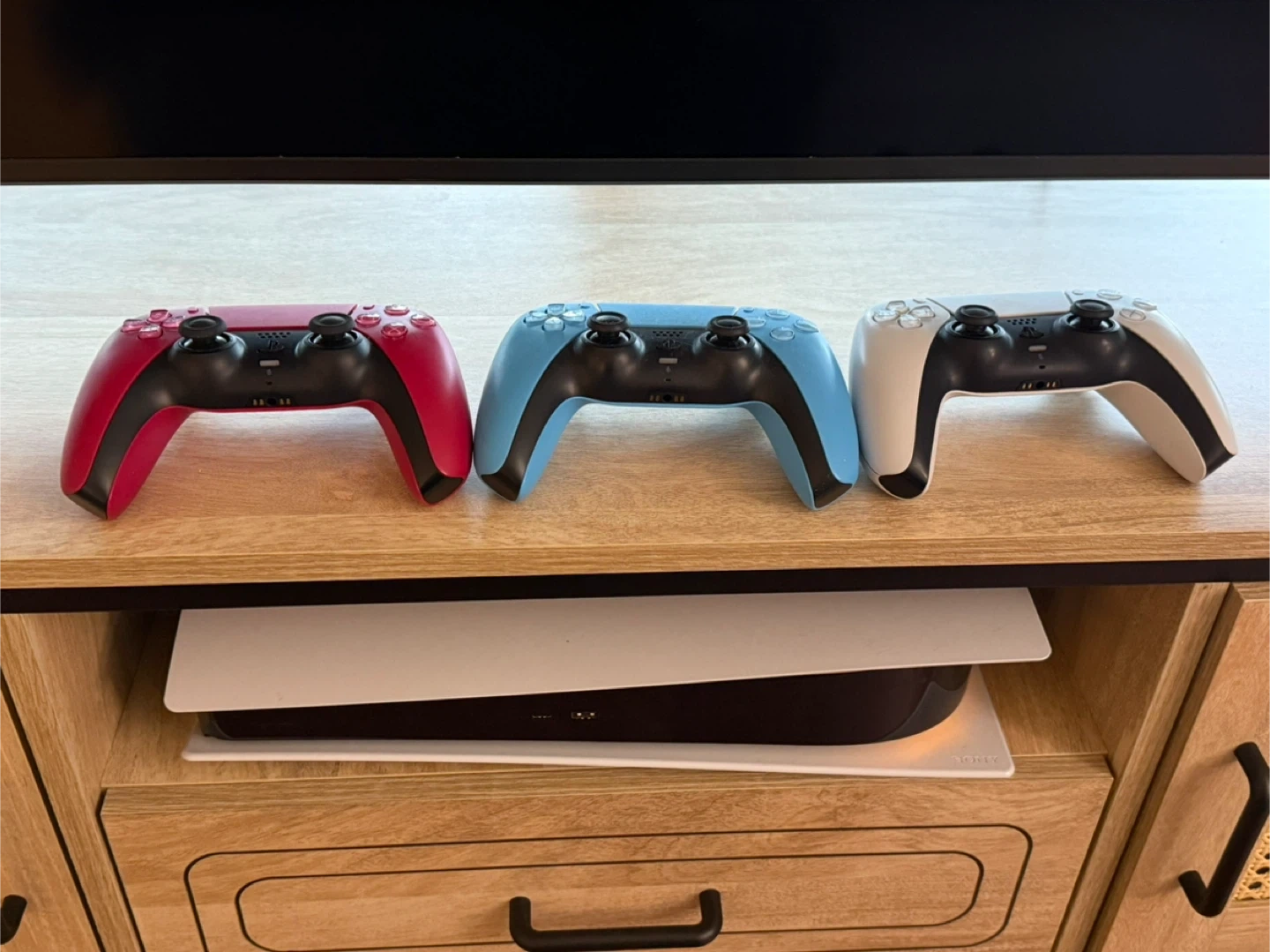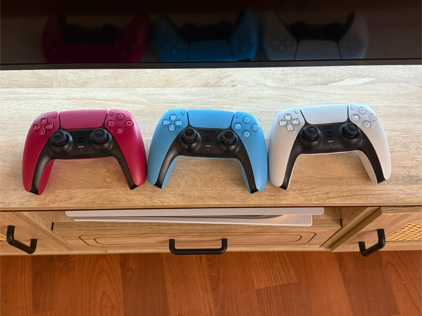 Selling PlayStation 5 + 3 DualSense controllers! Good condition and ready for a new home. One (pink) controller is completely new, other controllers and PS have been used for a year.