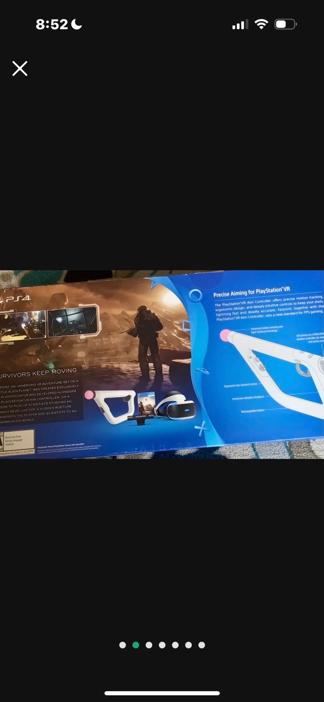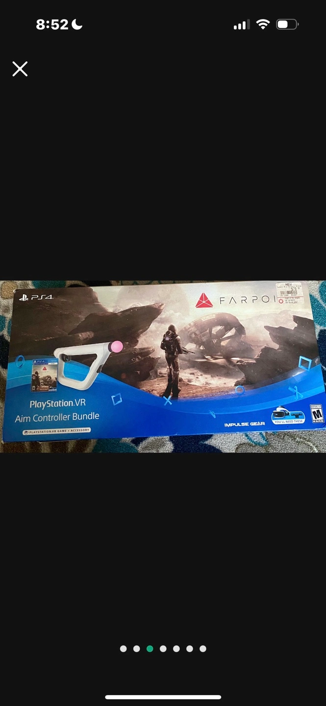 110Used PlayStation 4 console , VR Aim Controller Bundle, includes the VR headset, camera set needed for VR, one controller , aim controller and 2 joy sticks.
