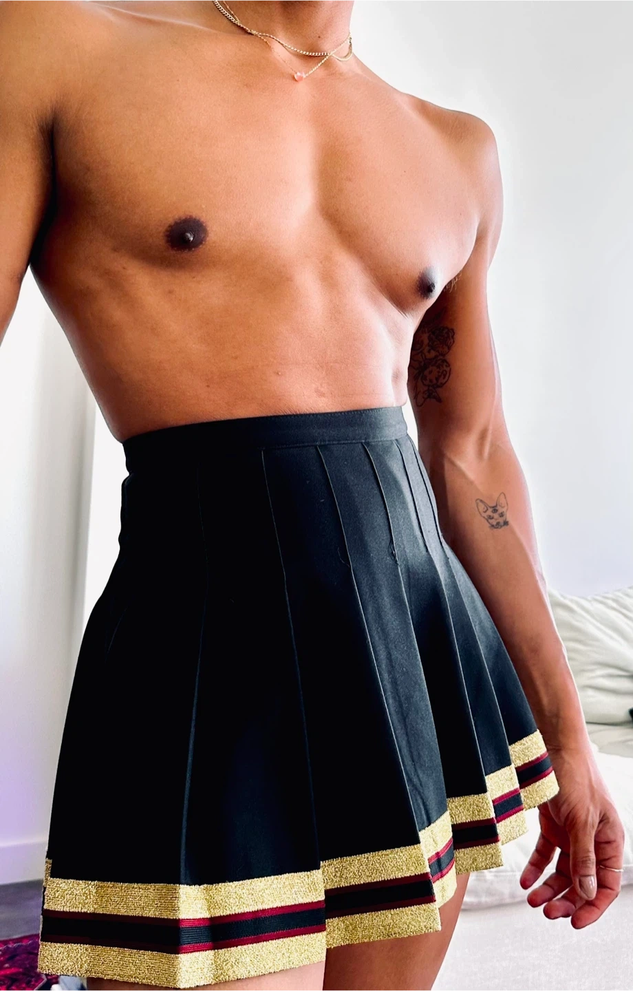 65Selling a cute pleated mini JV skirt! It's black with gold and red trim at the bottom and zip closure with an adjustable button at waist. Great for a fun night out or a stylish everyday look.
