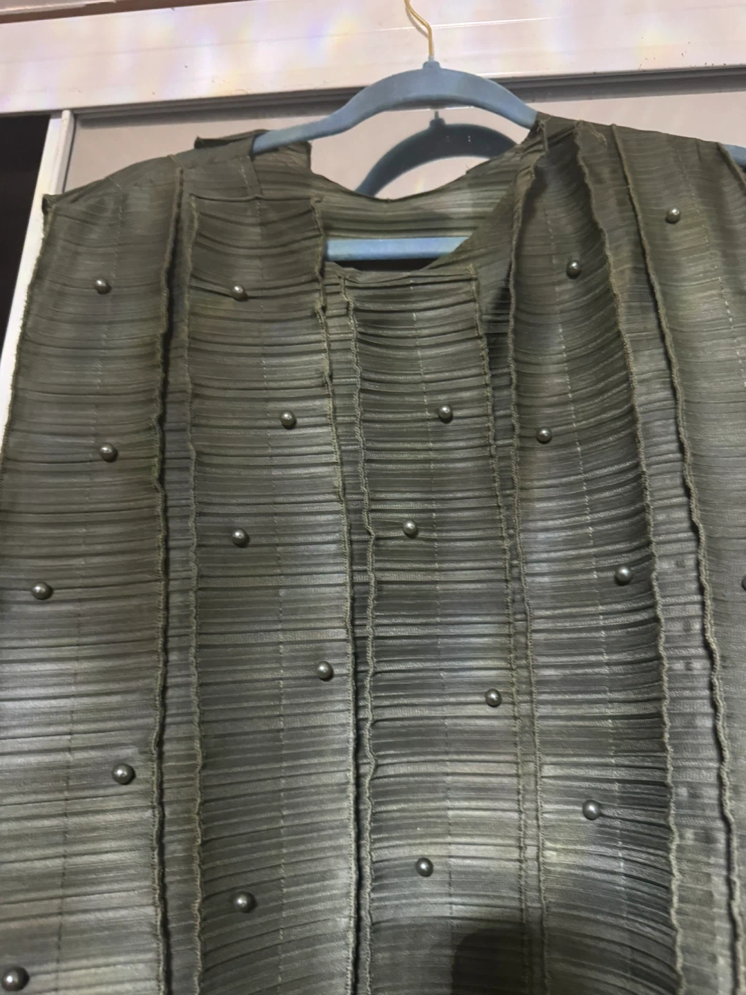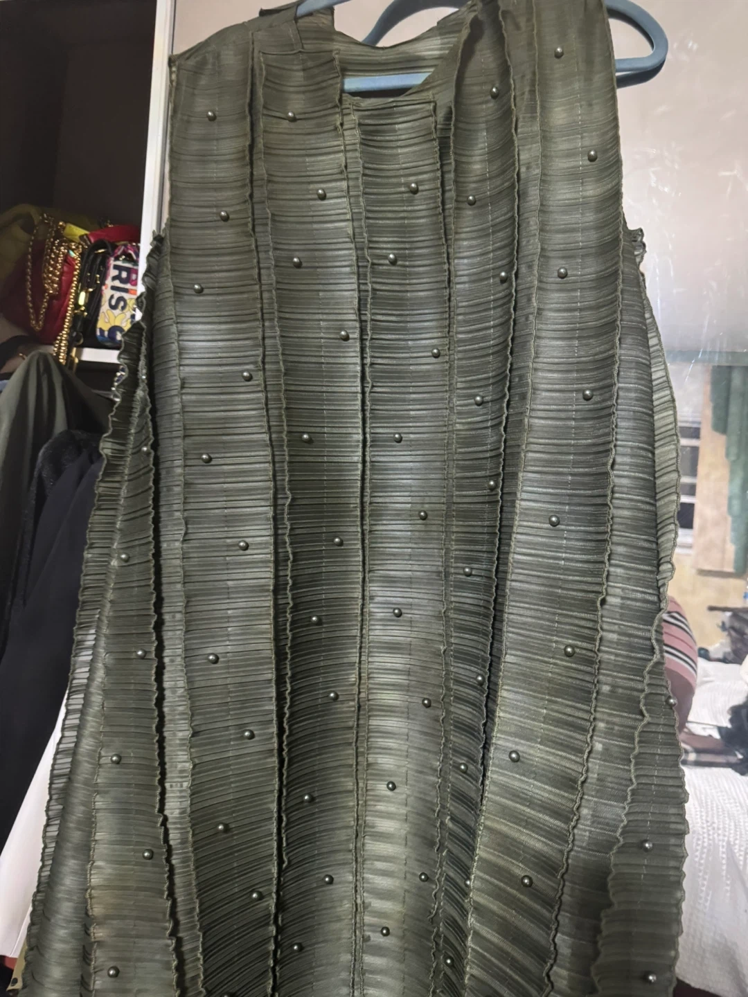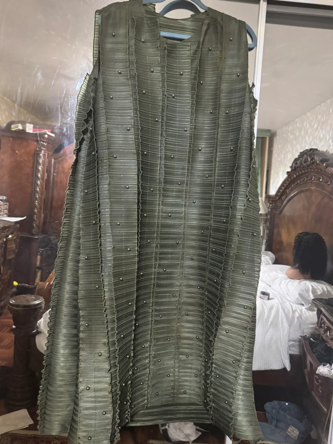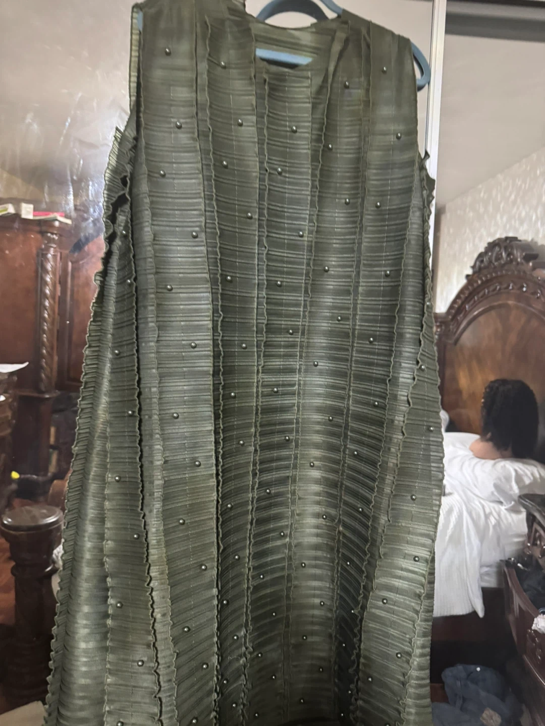 This is a pleated sleeveless dress. It is a green color. It has a unique design with small metal studs.