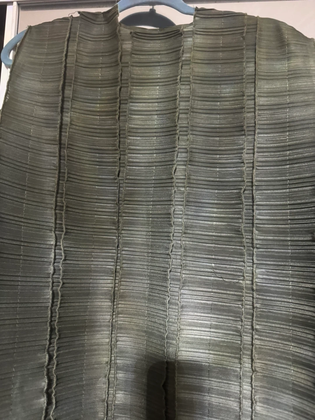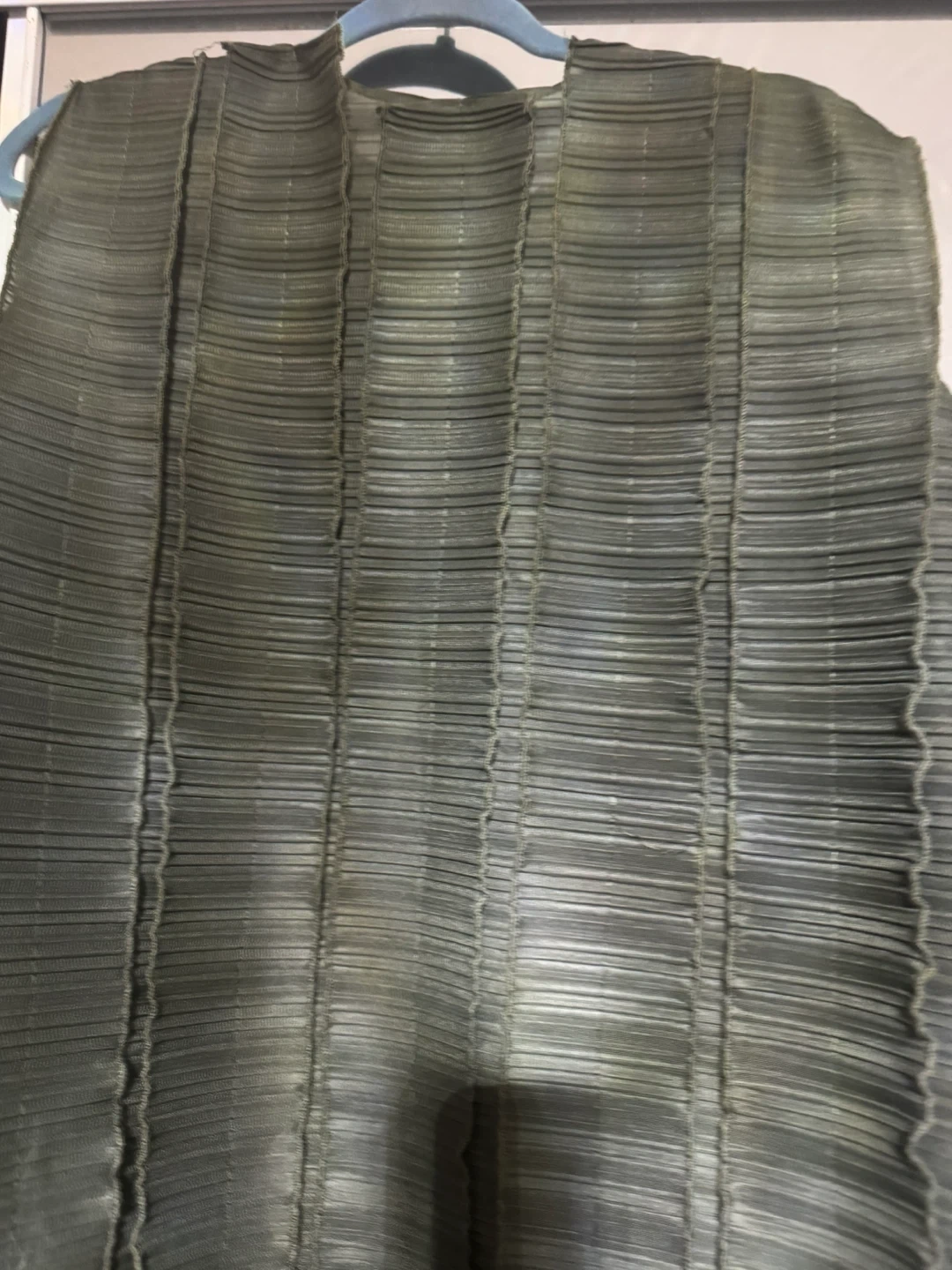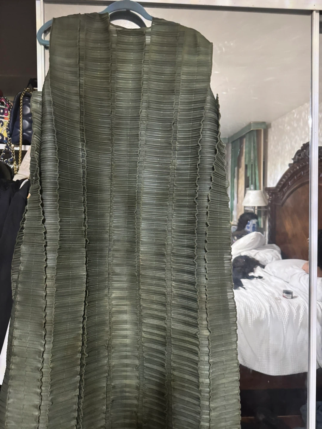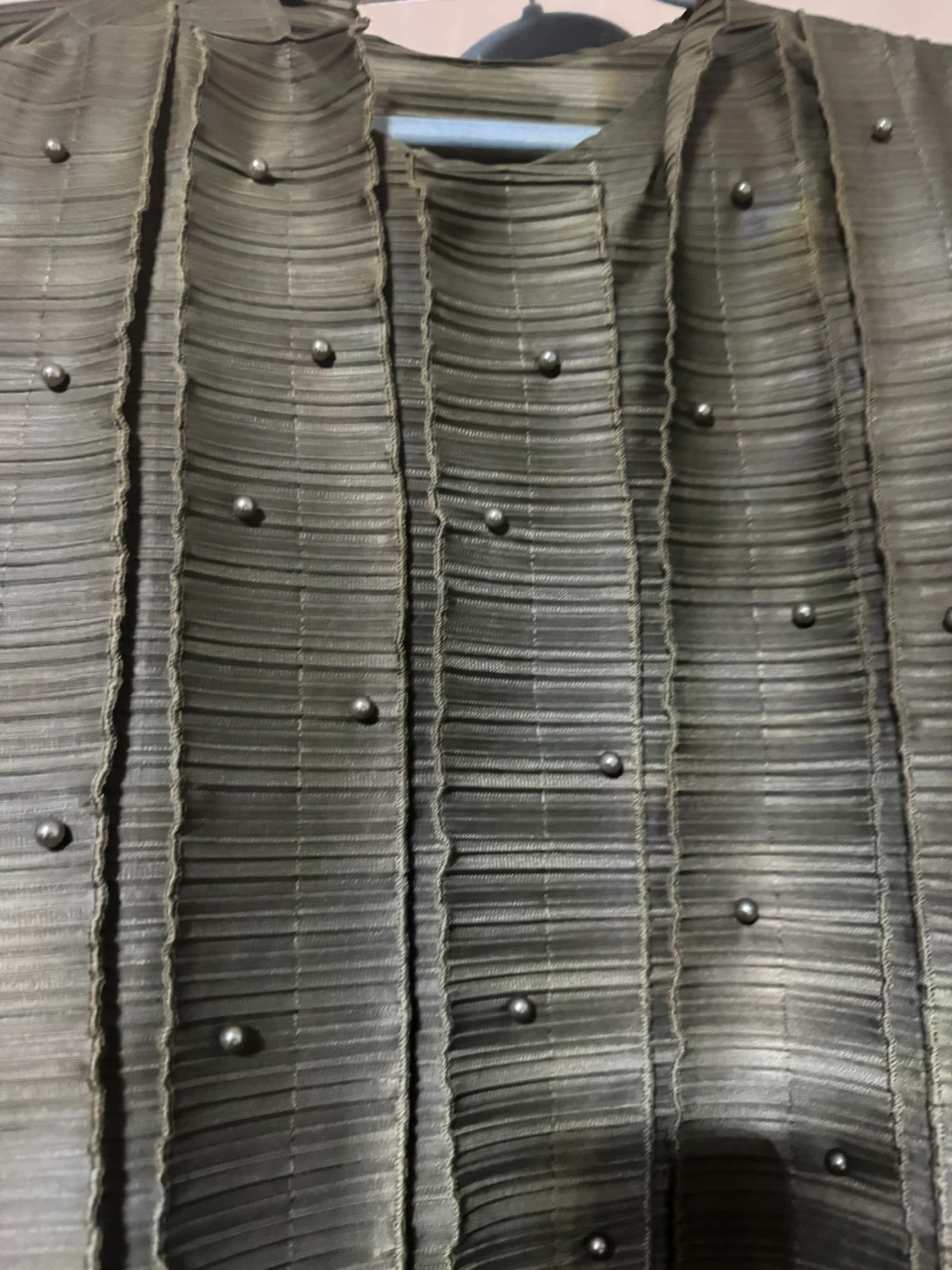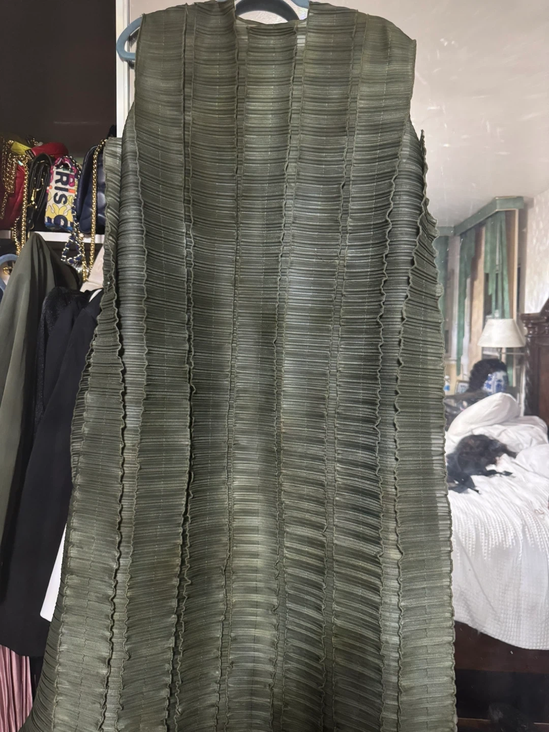 This is a pleated sleeveless dress. It is a green color. It has a unique design with small metal studs.