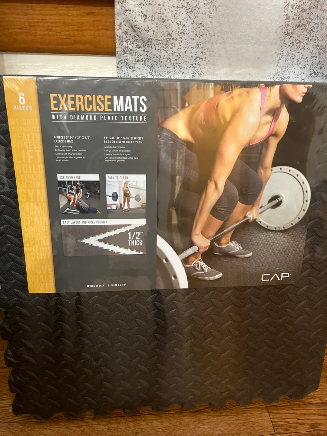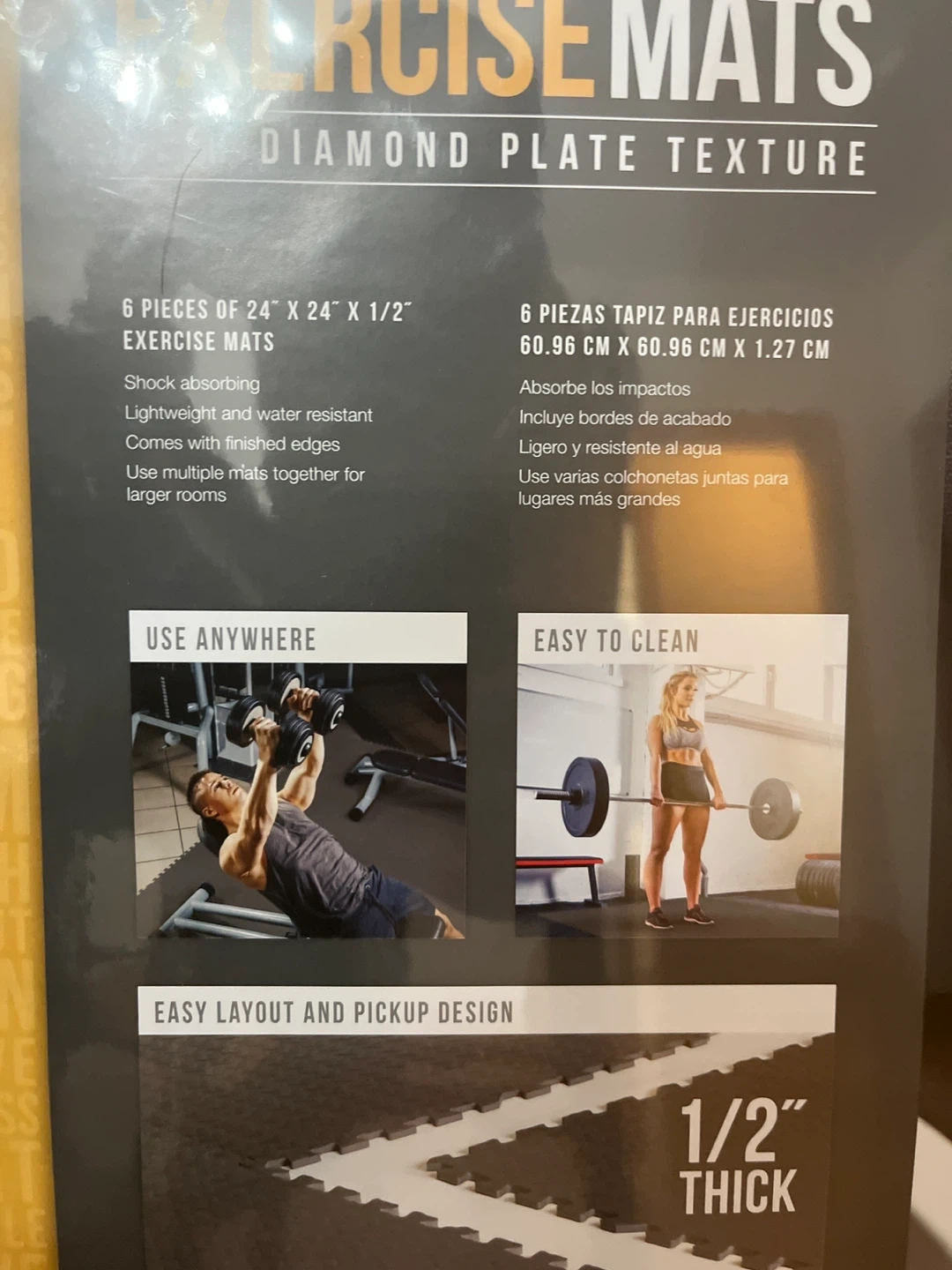 This set includes 6 interlocking exercise mats, each measuring 24" x 24" x 1/2". They're shock-absorbing, lightweight, and water-resistant with finished edges. Use multiple mats together for larger rooms. These mats are easy to clean and feature a diamond plate texture.
