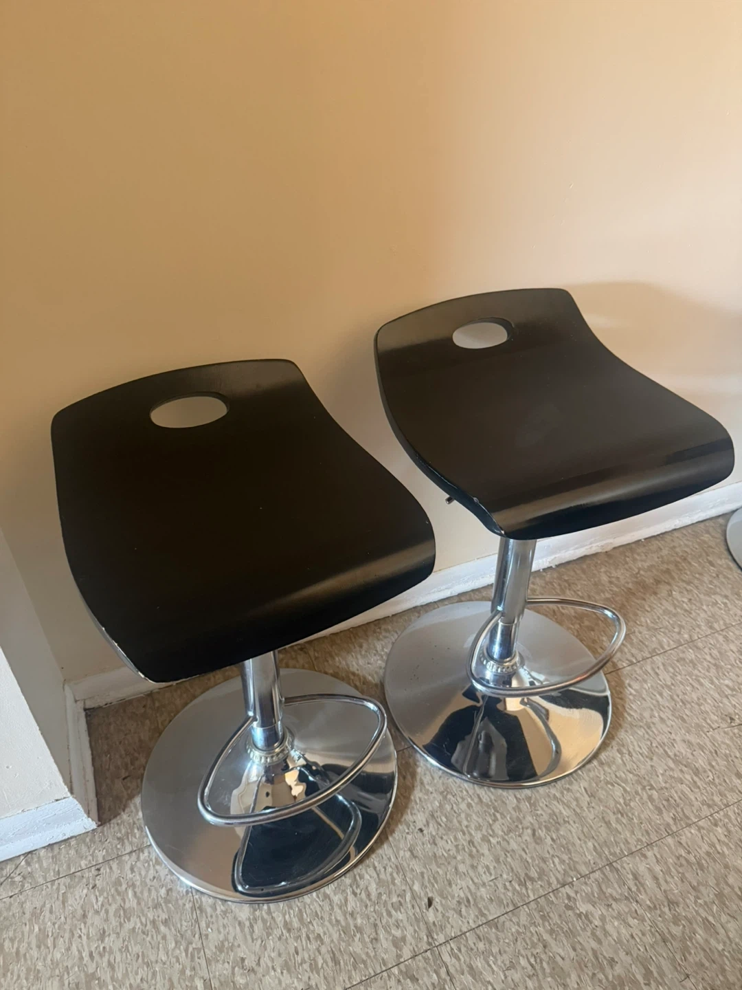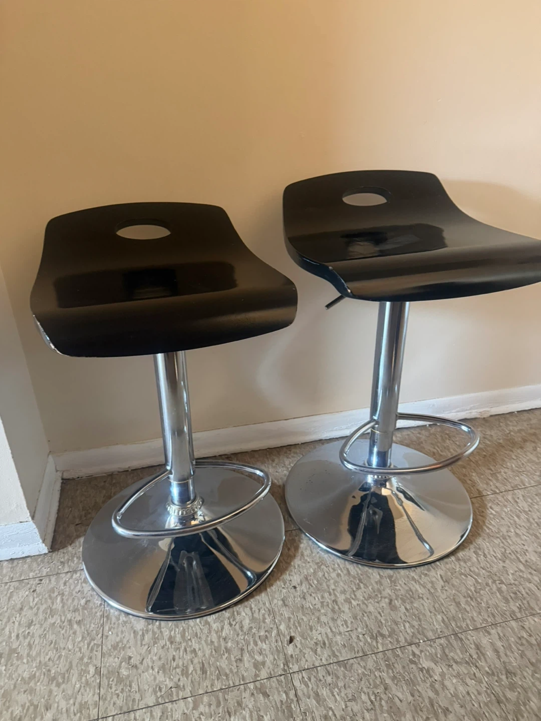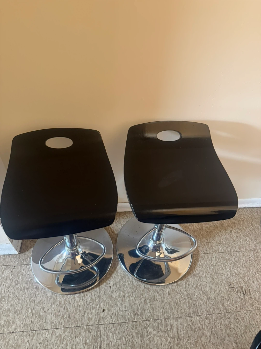 This listing is for a set of two black adjustable bar stools. They feature a sleek, modern design with chrome bases and footrests. The seats are contoured for comfort and have a hole for easy handling. The height is adjustable via a lever.