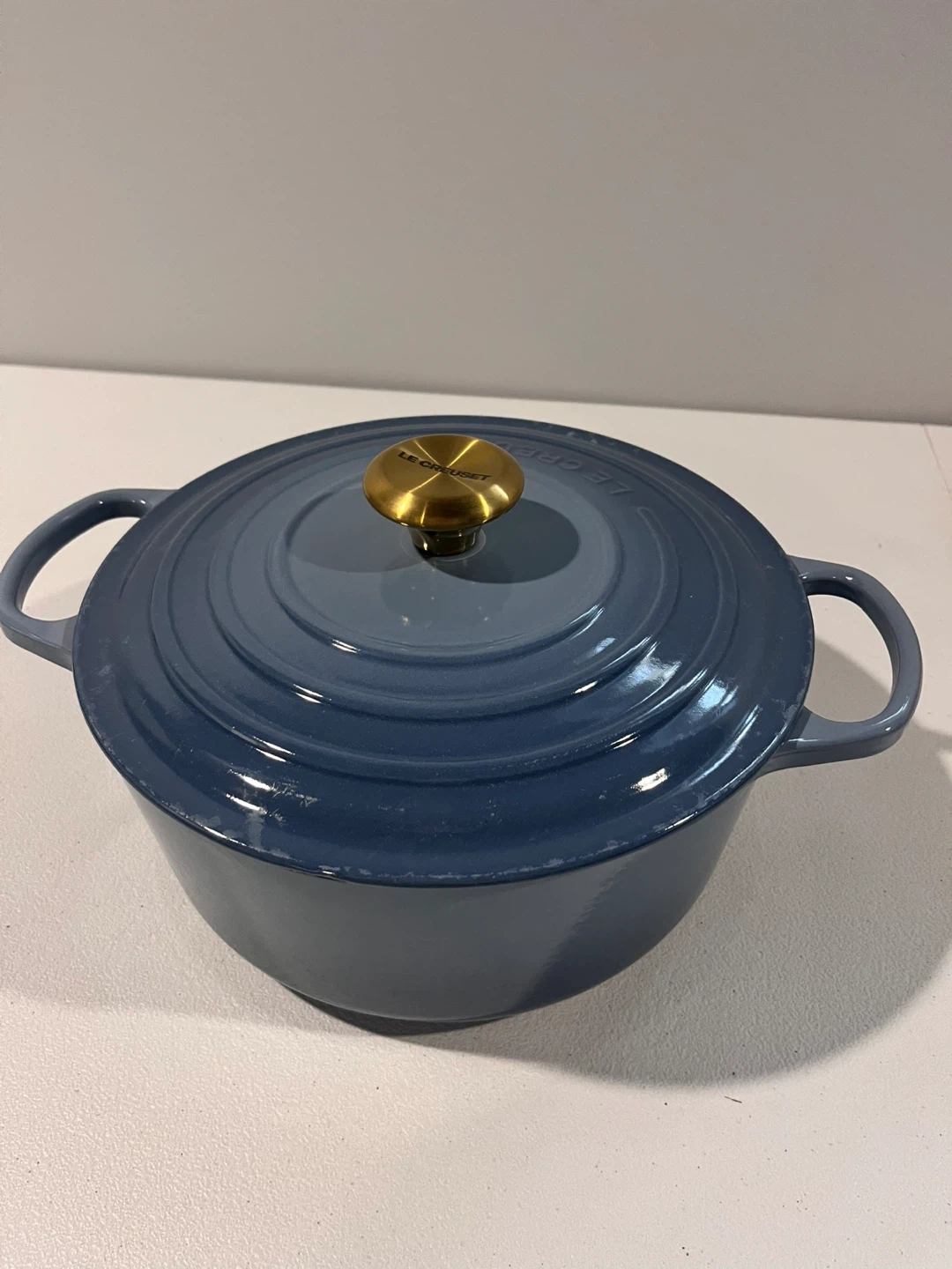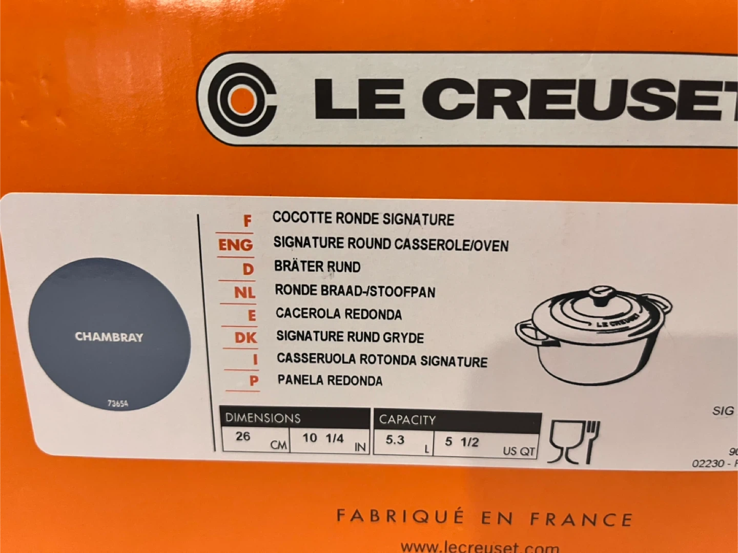 Selling a beautiful Le Creuset Round Dutch Oven in the Chambray color! It's a 5.3 quart size and comes with the original box. The dimensions are 10 1/4 inches or 26 cm. This signature round casserole/oven is perfect for all your cooking needs