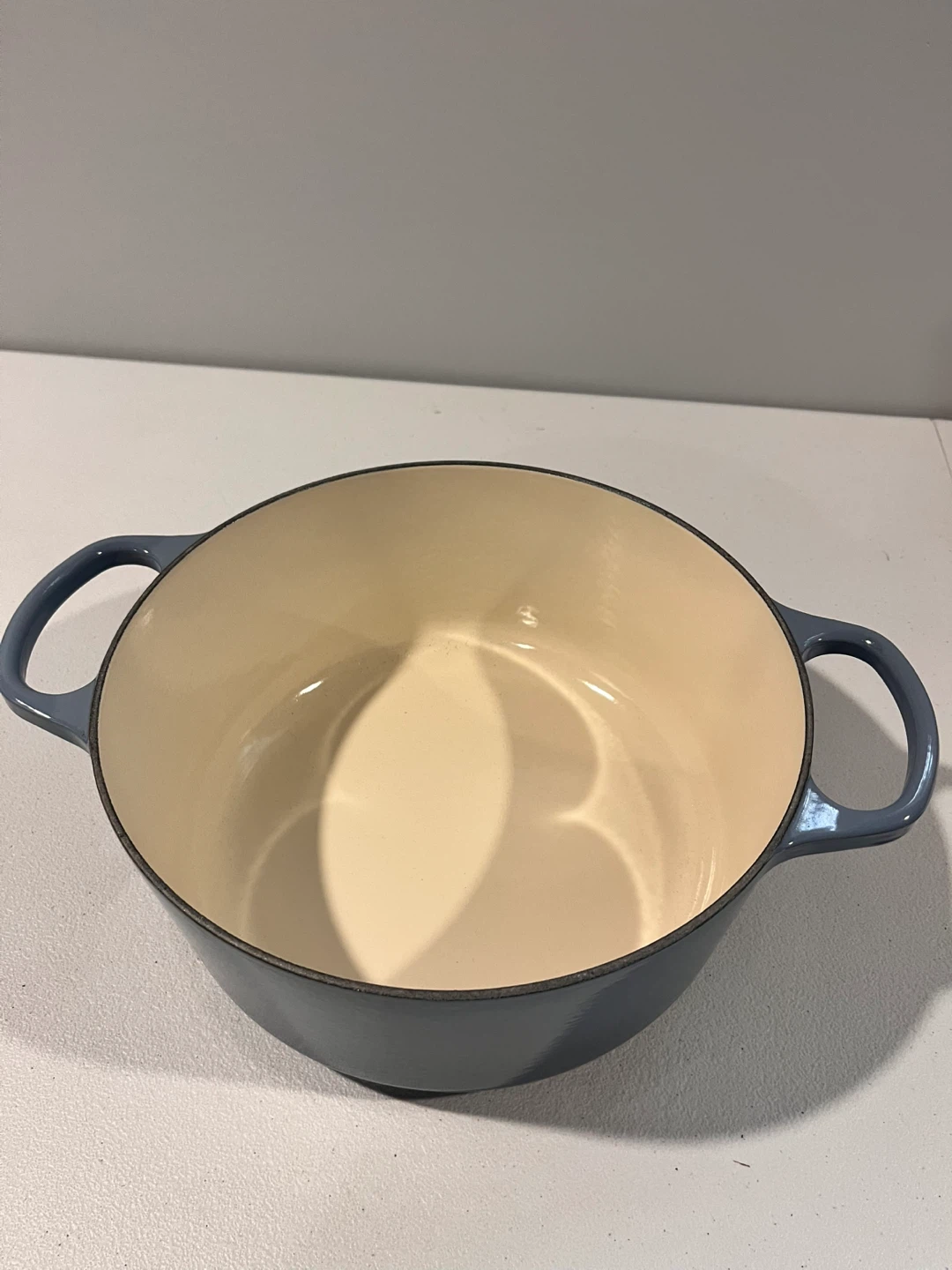 Selling a beautiful Le Creuset Round Dutch Oven in the Chambray color! It's a 5.3 quart size and comes with the original box. The dimensions are 10 1/4 inches or 26 cm. This signature round casserole/oven is perfect for all your cooking needs