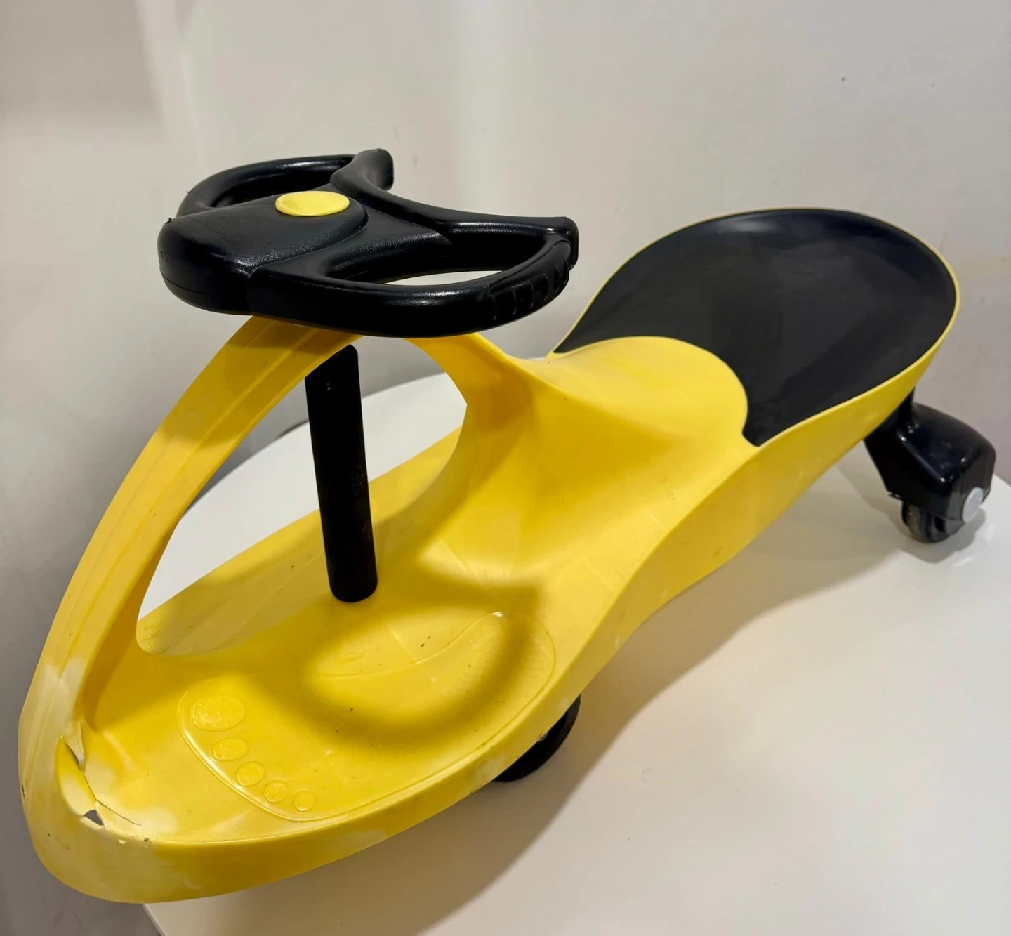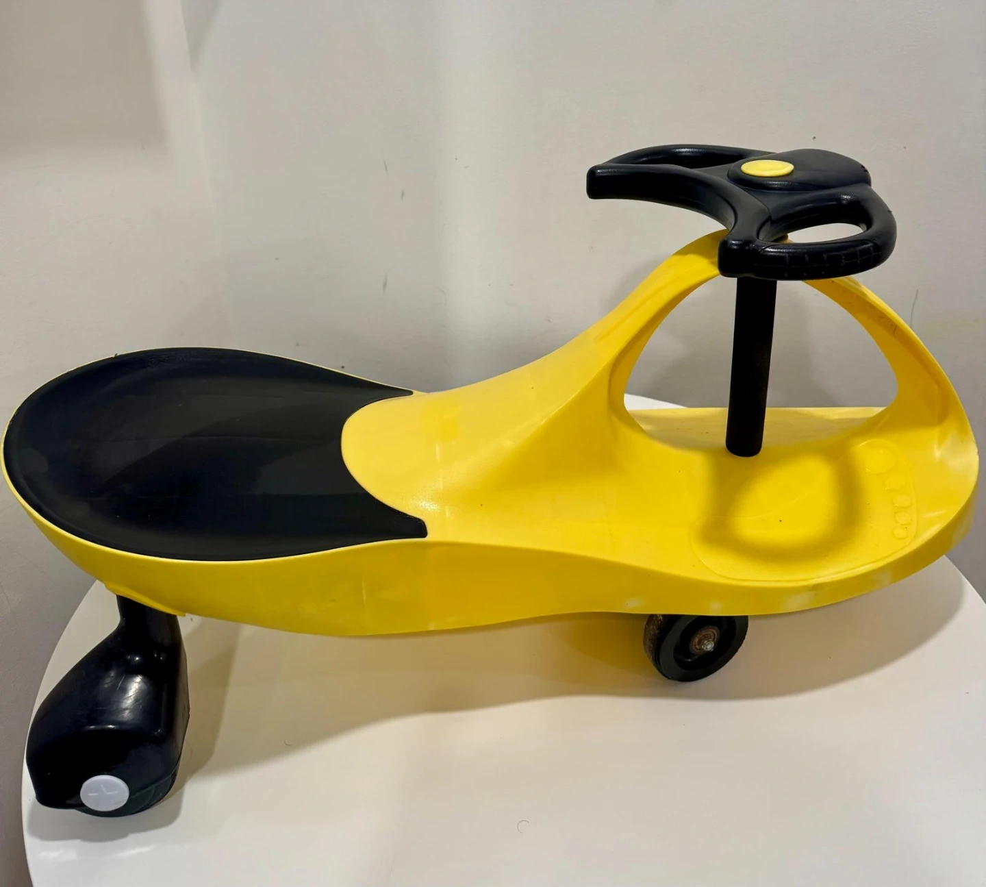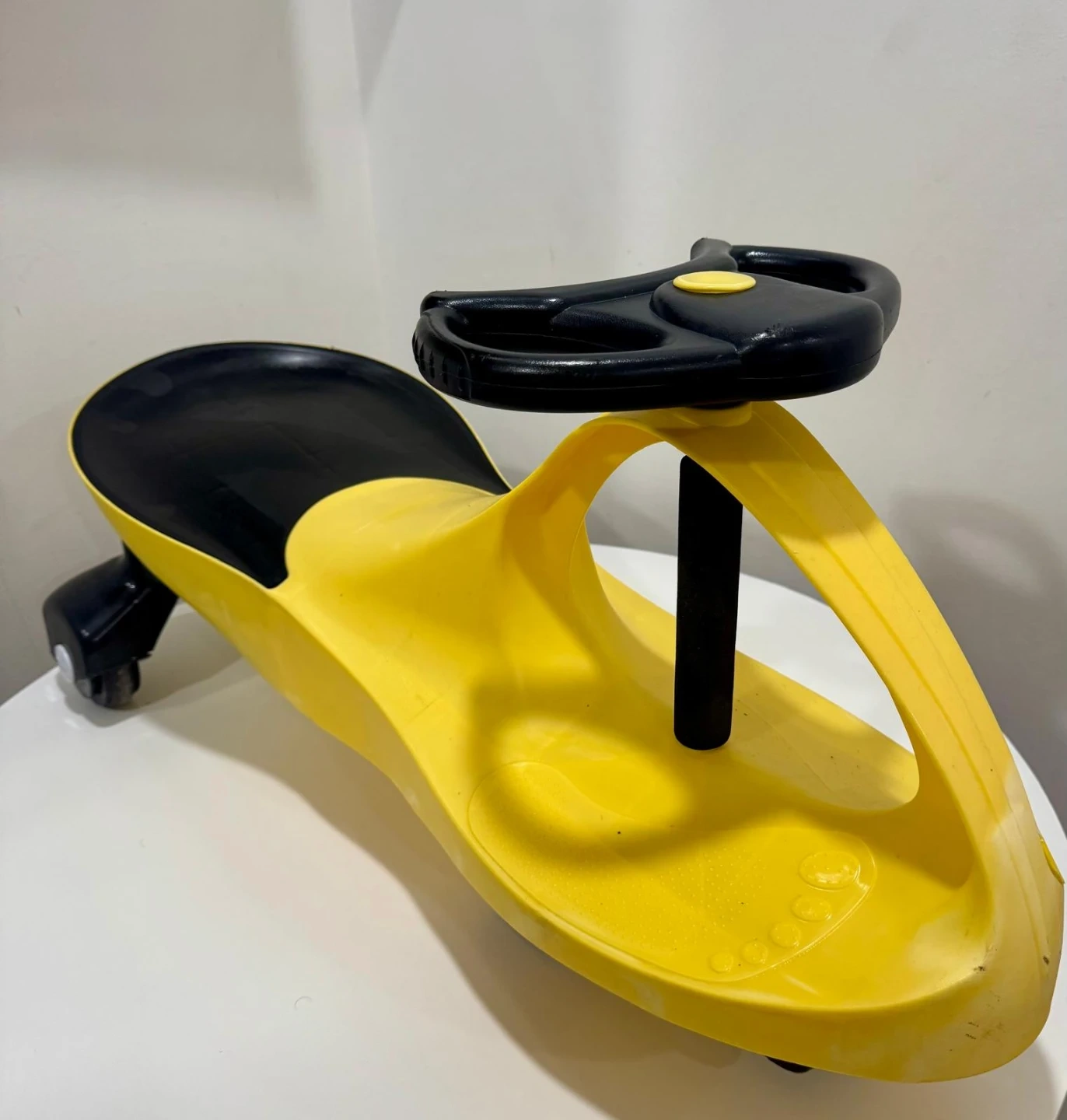 This is a fun wiggle car for kids, designed with a bright yellow body and a black seat and steering wheel. It's made of durable plastic and features easy-to-grip handles. Kids can have a blast zipping around indoors or outdoors!