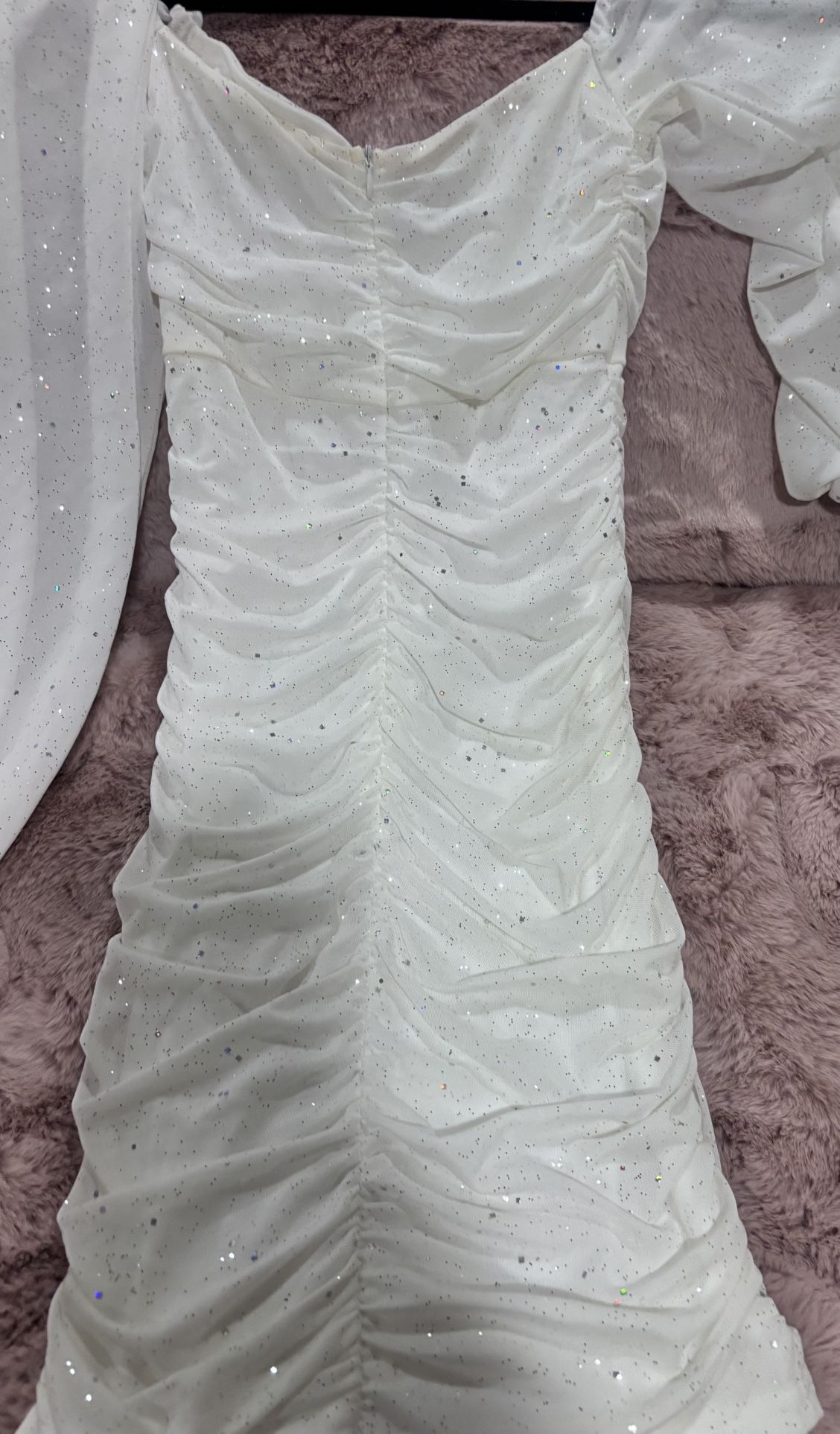 Stunning sparkly white bodycon dress in extra small with an ultra-flattering ruched design. This dress features a subtle all-over glitter mesh overlay that catches the light beautifully, sheer long puff sleeves with adjustable tie cuffs, and a sweetheart neckline with front ruching for a feminine, sculpted fit. Perfect for parties, birthdays, bachelorette nights, bridal events, or a dressy night out. Size: Extra Small (XS) 24 inches look. Short Color: White / Ivory with subtle glitter Style: Bodycon, ruched front & sides Long sheer sleeves with adjustable ties Stretchy, figure-hugging fit Zipper in the back Excellent condition Best for XS / petite frames. Ruching allows some flexibility and creates a very flattering silhouette.