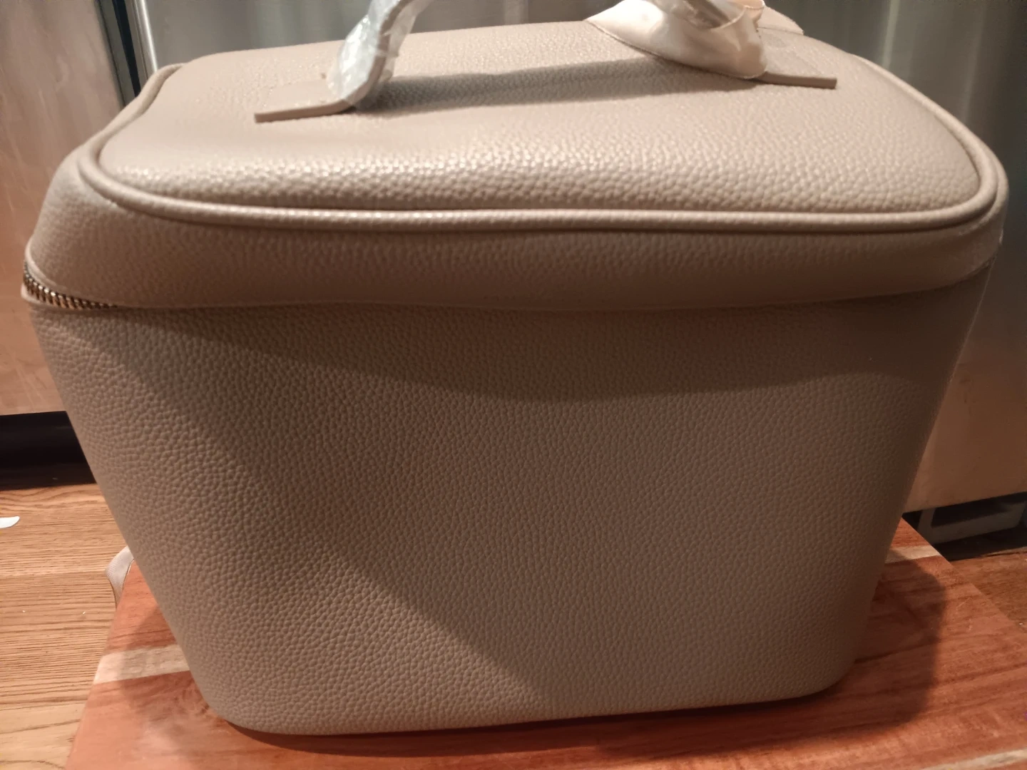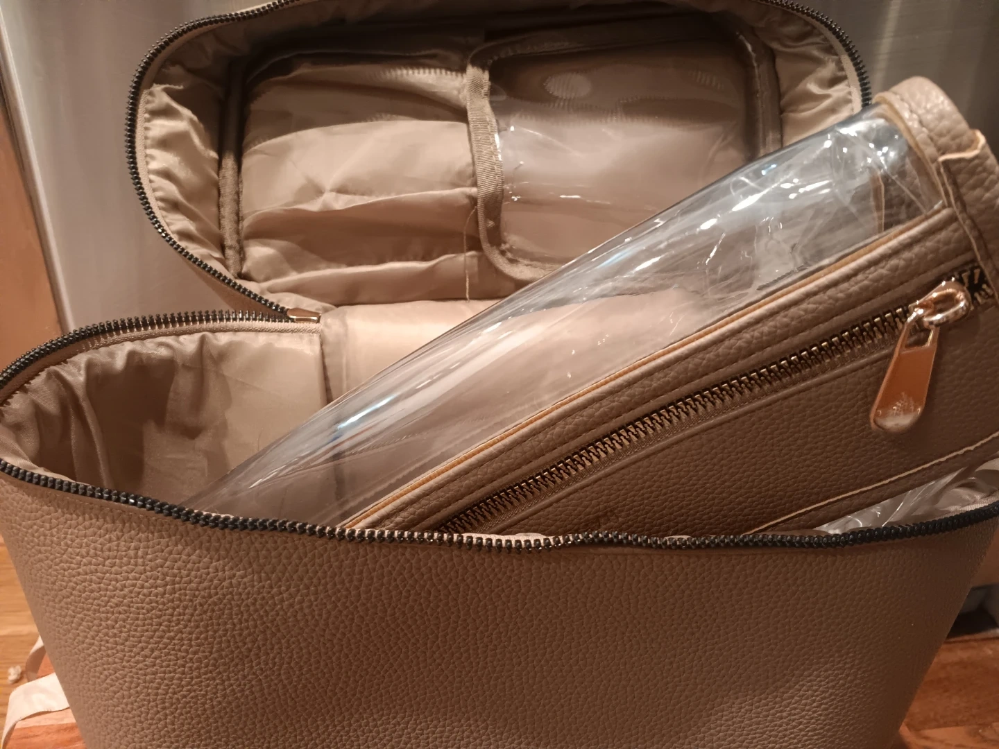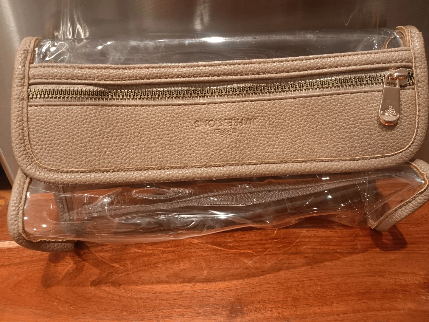This Impressions toiletry bag is a light tan color and made of faux leather. It features a main compartment and an interior clear pouch with its own zipper. It's a great size for travel or everyday use!