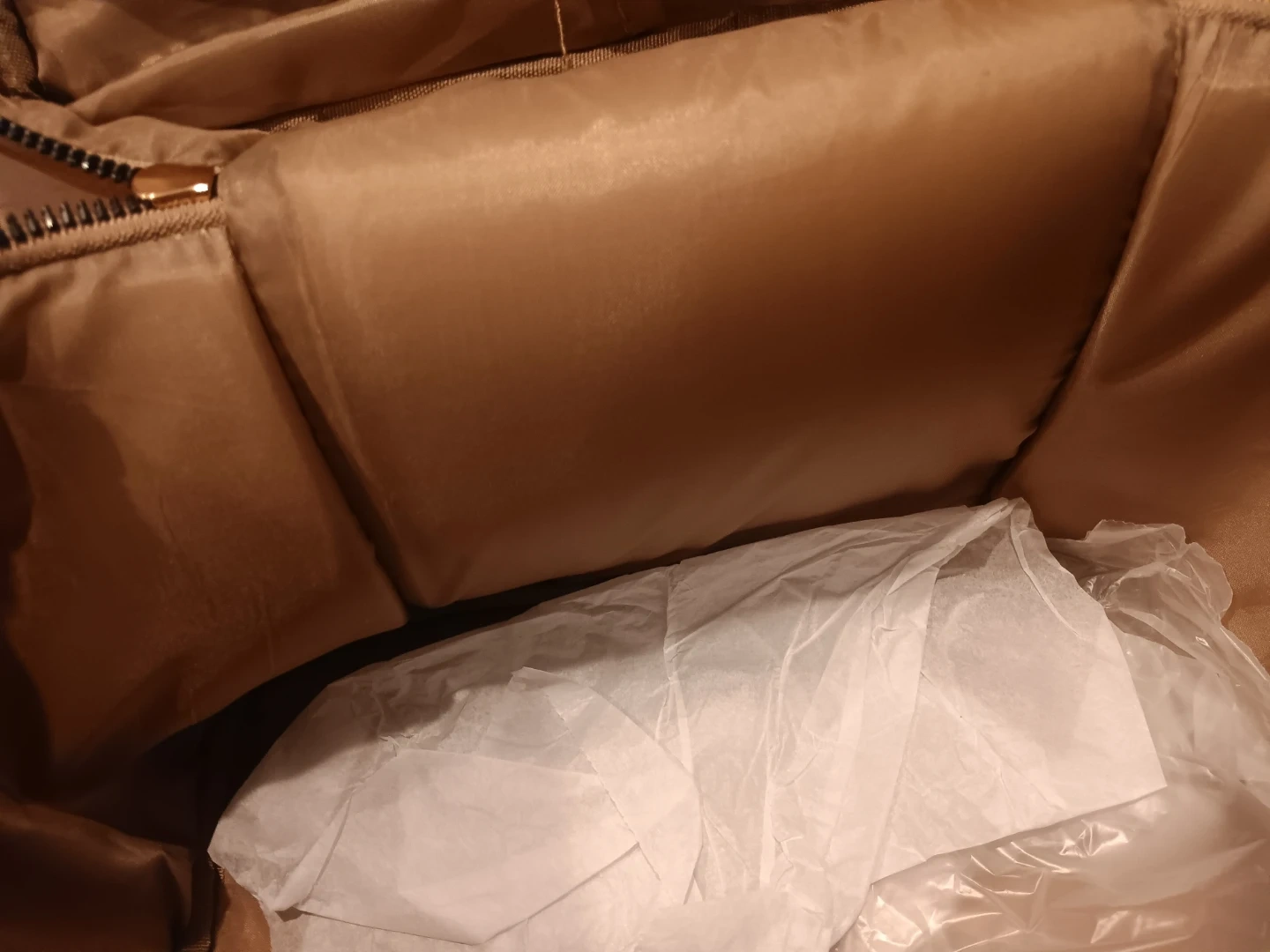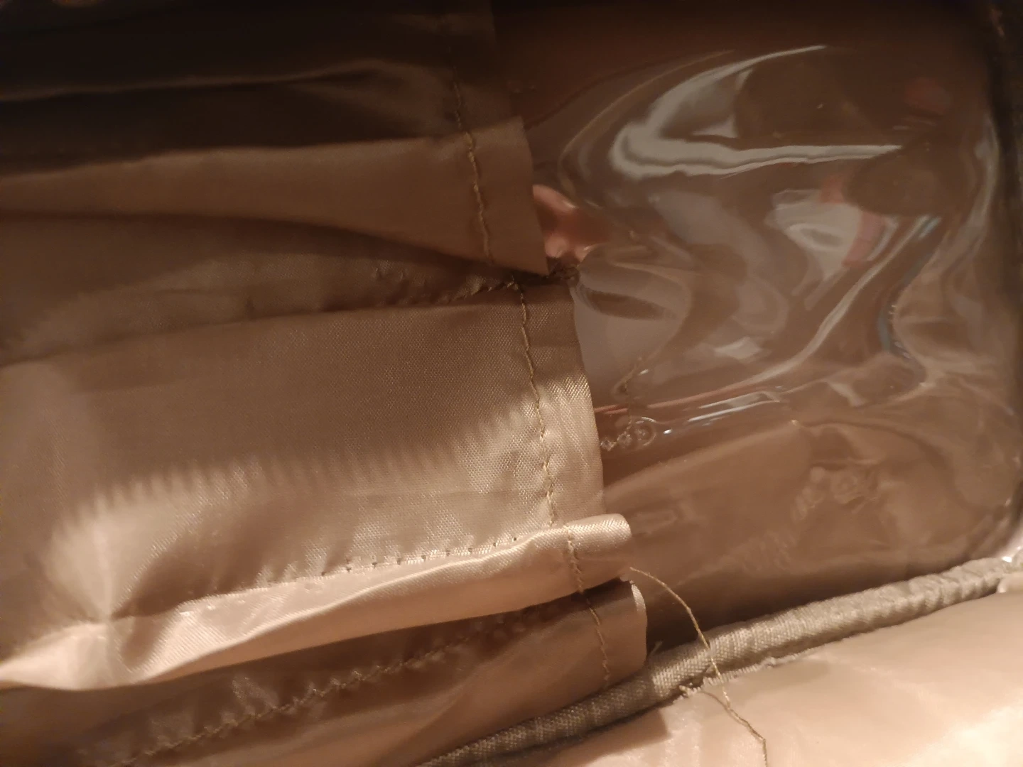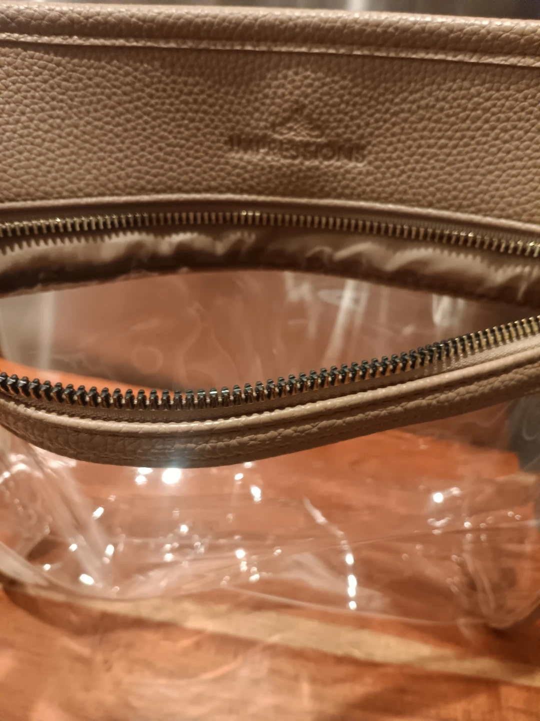 This Impressions toiletry bag is a light tan color and made of faux leather. It features a main compartment and an interior clear pouch with its own zipper. It's a great size for travel or everyday use!