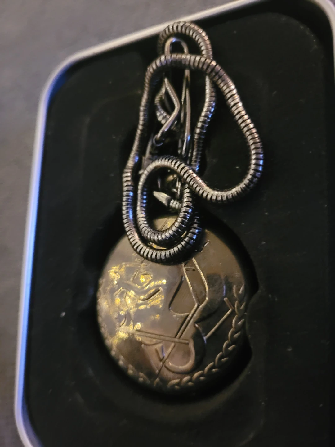 25Selling a pocket watch. It has a chain and comes in a box. The watch face has Roman numerals. The inside of the cover has the phrase 'Don't Forget from Full metal alchemist