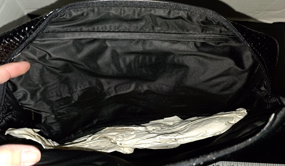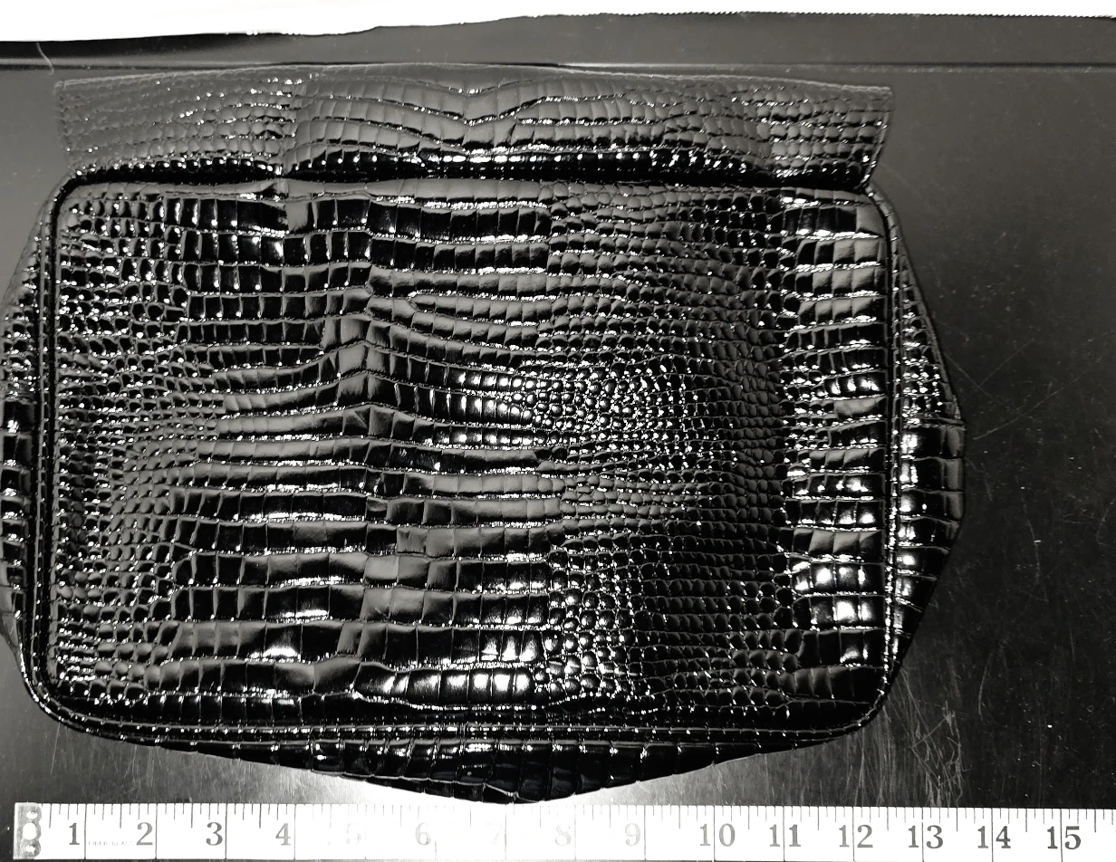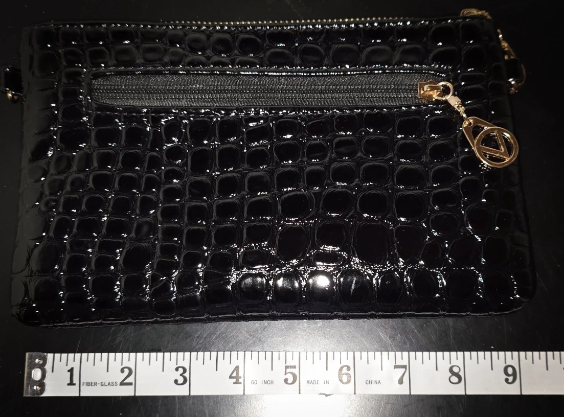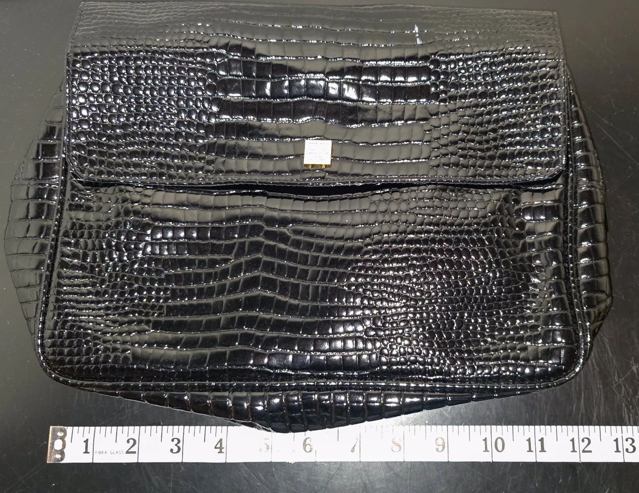 This is a Valentino Orlandi black clutch with a shiny, reptile-like texture. It features a top flap closure and a smaller zippered compartment on the back with a gold-tone Valentino logo charm. It measures approximately 13 inches in length.