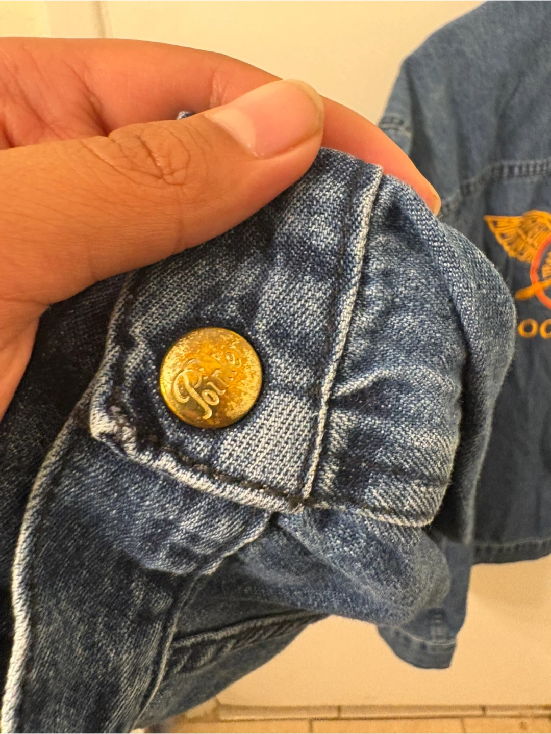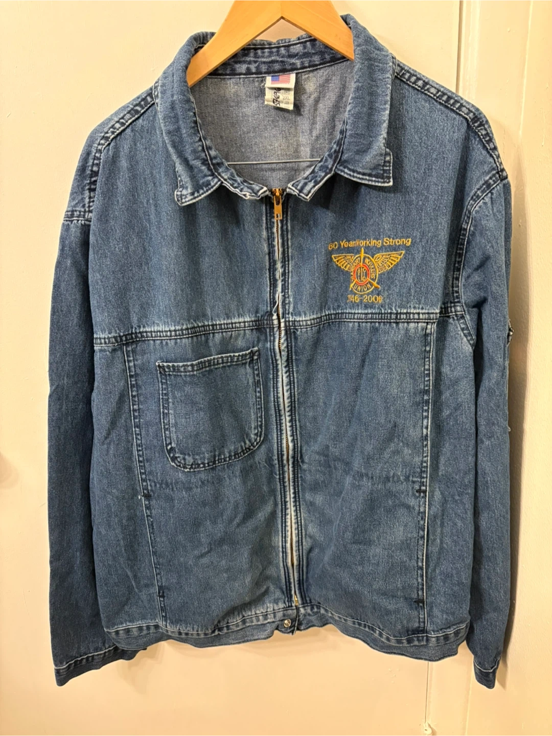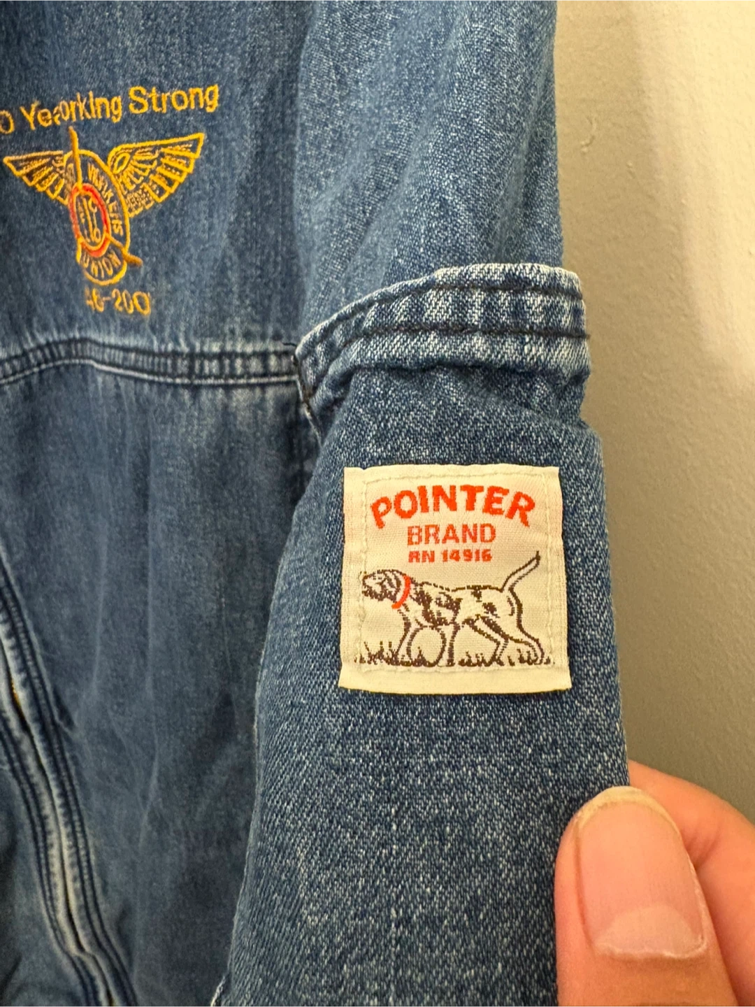25Selling a Pointer Brand denim jacket. The jacket has a zipper closure and an embroidered logo on the front and back. It's in good condition and ready for a new home. Jacket may have some wear from previous use.