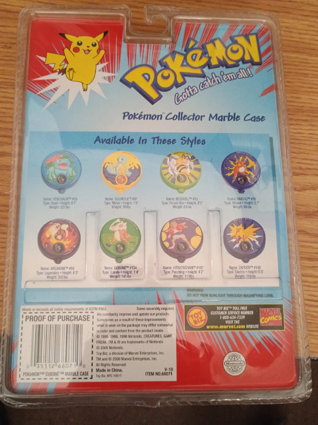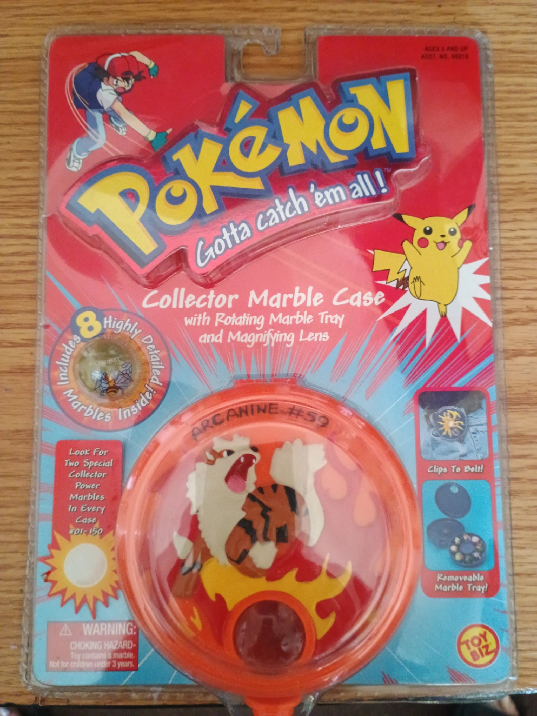Selling a brand new, in-package Pokemon Collector Marble Case featuring Arcanine #59! This case includes a rotating marble tray and magnifying lens. It also comes with 8 highly detailed marbles inside. Clips to belt and has a removable marble tray. A fun collectible for any Pokemon fan!